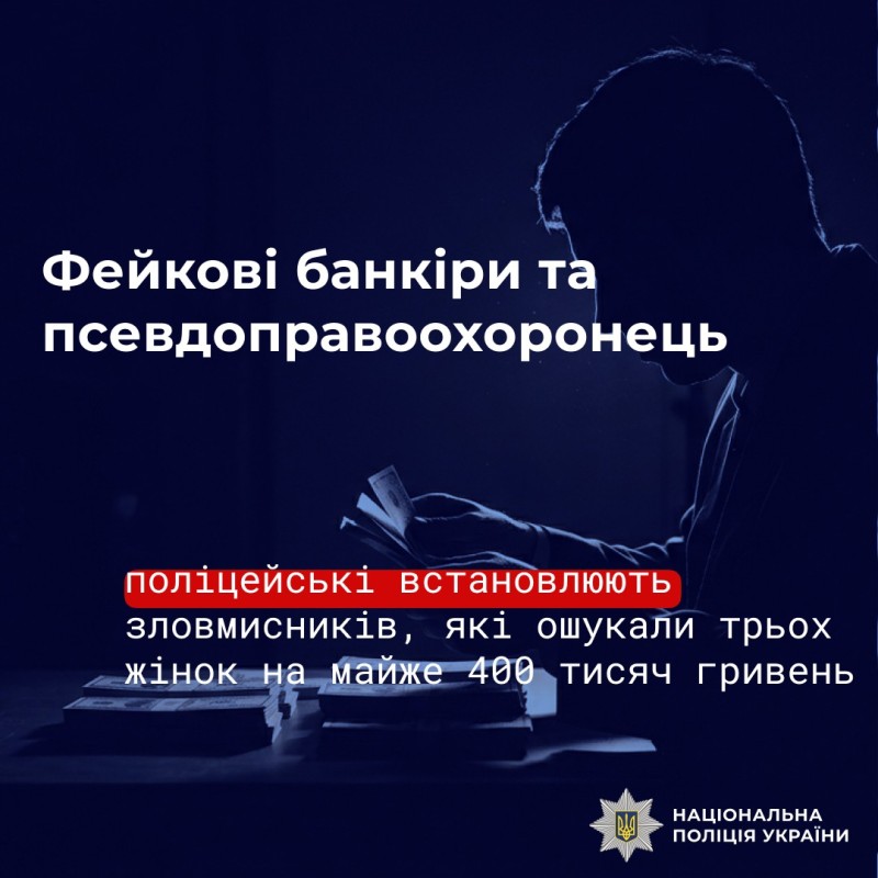 Фейкові банкіри та псевдоправоохоронець: у Миколаївському районі поліцейські встановлюють зловмисників, які ошукали трьох жінок на майже 400 тисяч гривень