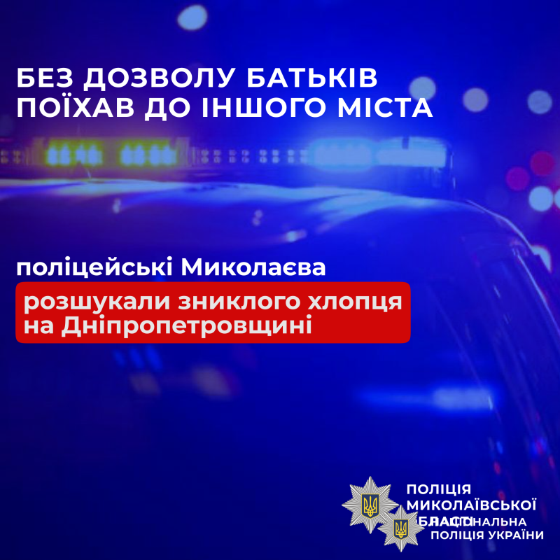 Без дозволу батьків поїхав до іншого міста: поліцейські Миколаєва розшукали зниклого хлопця на Дніпропетровщині