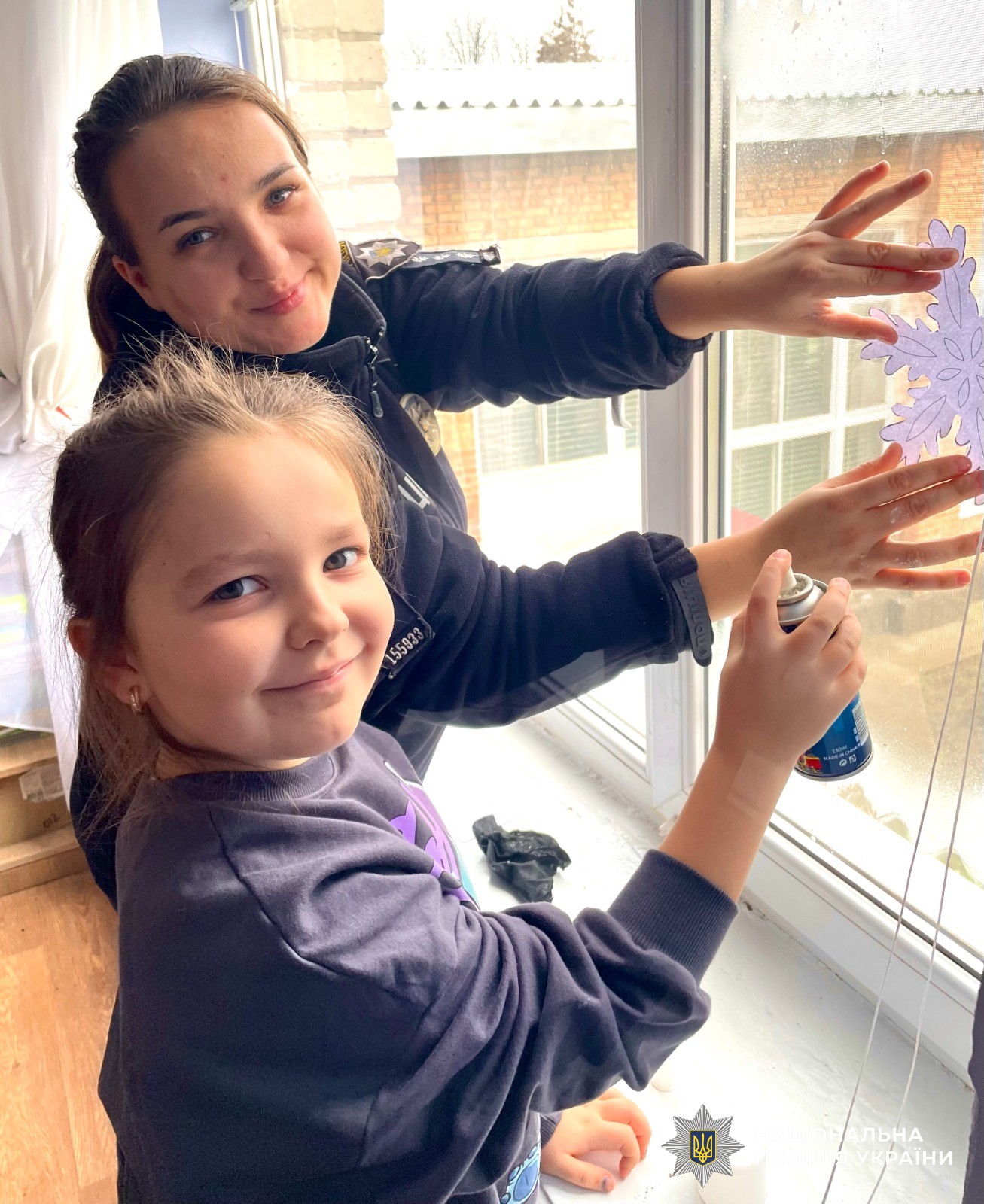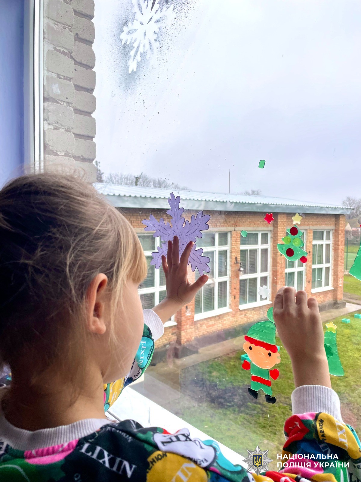 Виготовлені власноруч паперові витинанки, орнаменти, силуети казкових героїв, зірки, сніговики та інші тематичні елементи – саме так під час заходу створювали у навчальних закладах затишну та святкову атмосферу поліцейські разом із дітьми, декоруючи вікна.