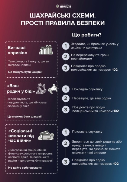 Якщо ж ви все таки потрапили до шахрайської пастки, одразу зверніться до найближчого відділення поліції або телефонуйте на спецлінію 102.