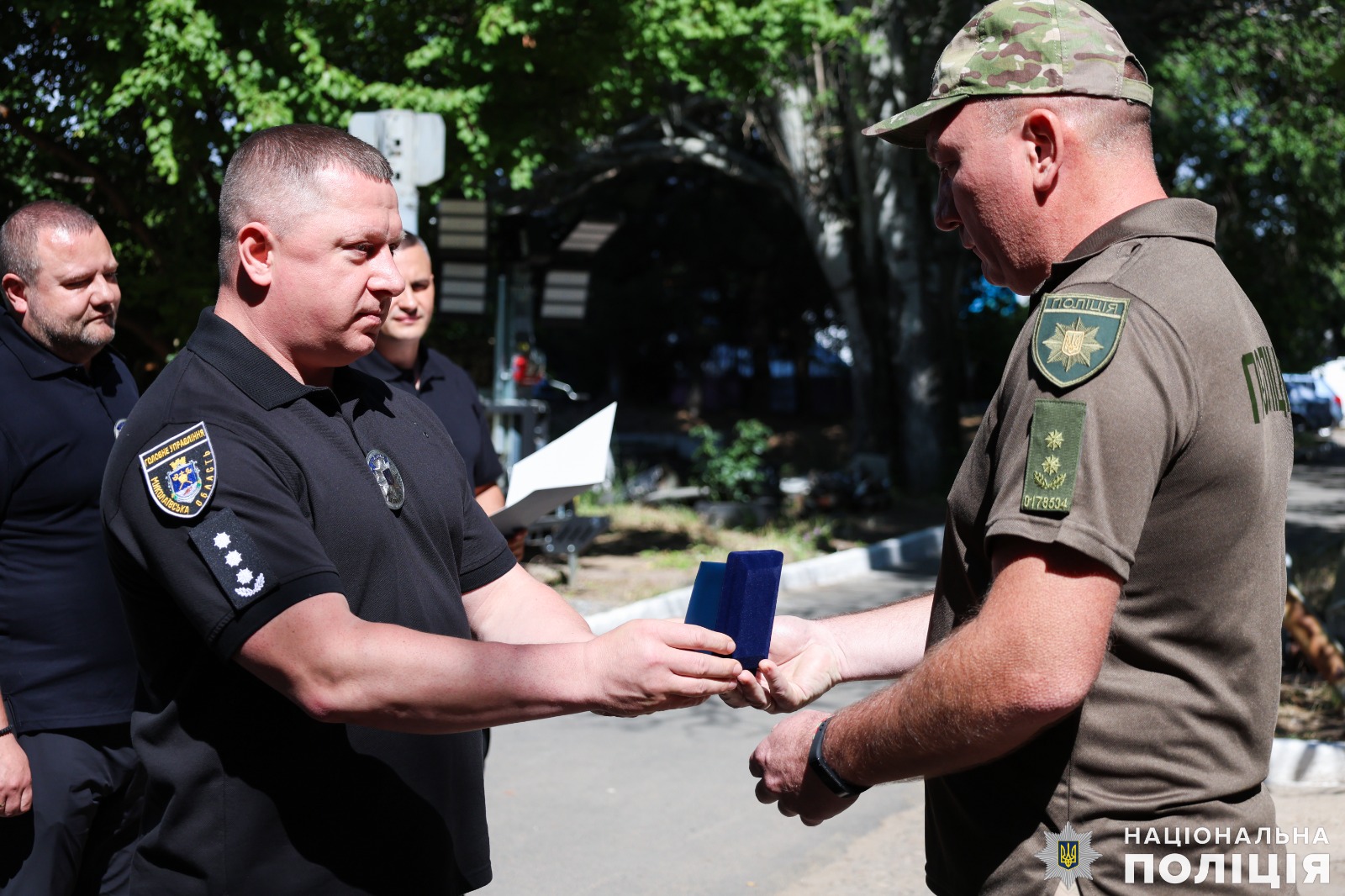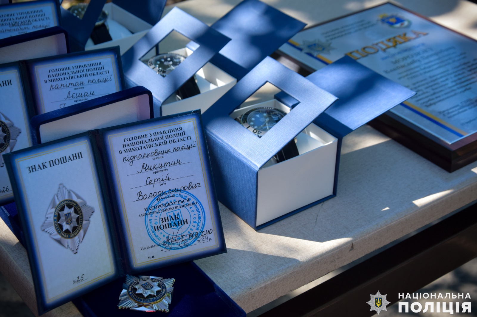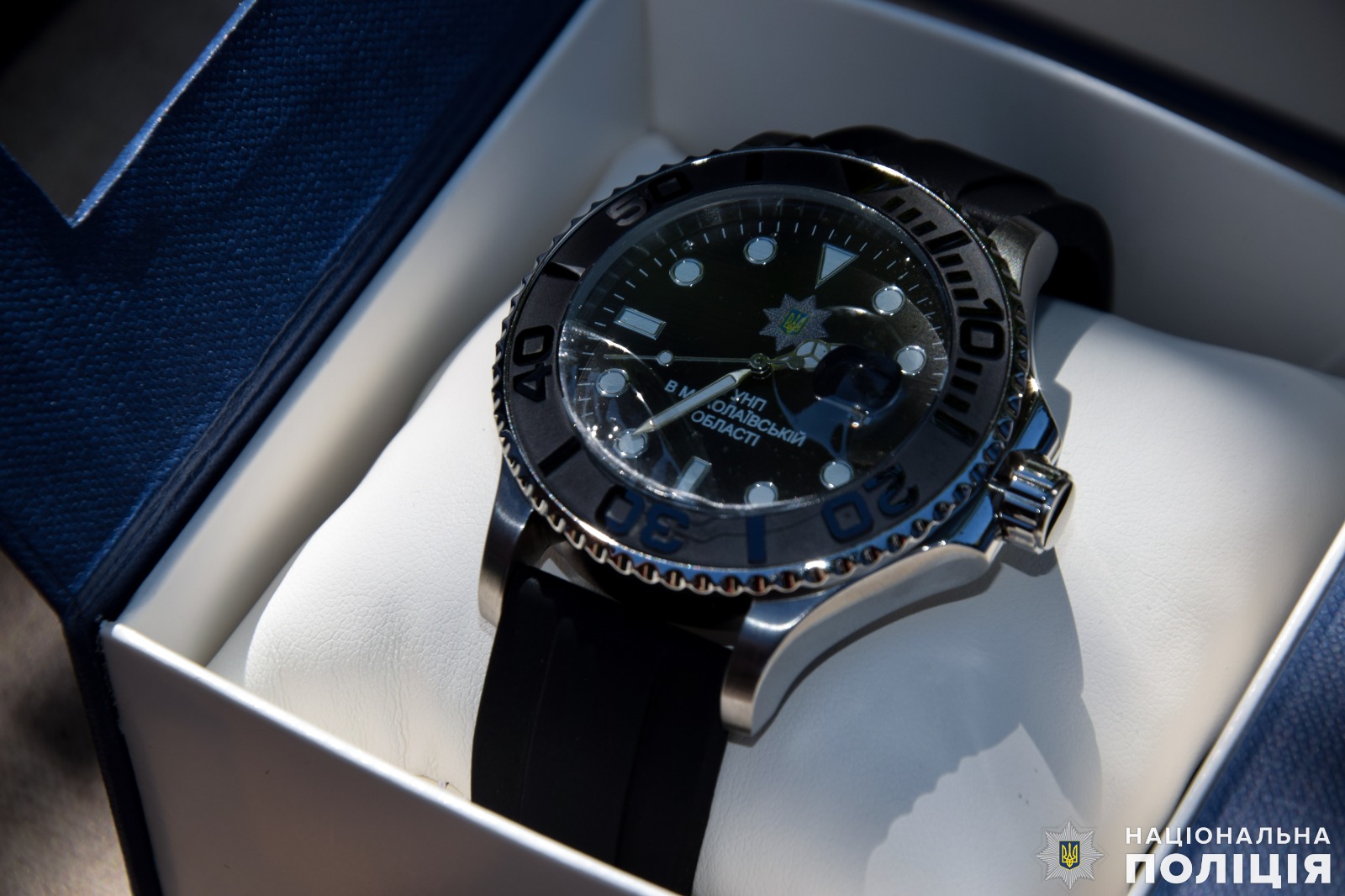 З нагоди професійного свята, начальник обласного главку поліції Сергій Махно відзначив правоохоронців вибухотехніків за мужність та відвагу відомчими відзнаками, подяками та цінними подарунками – наручними годинниками.