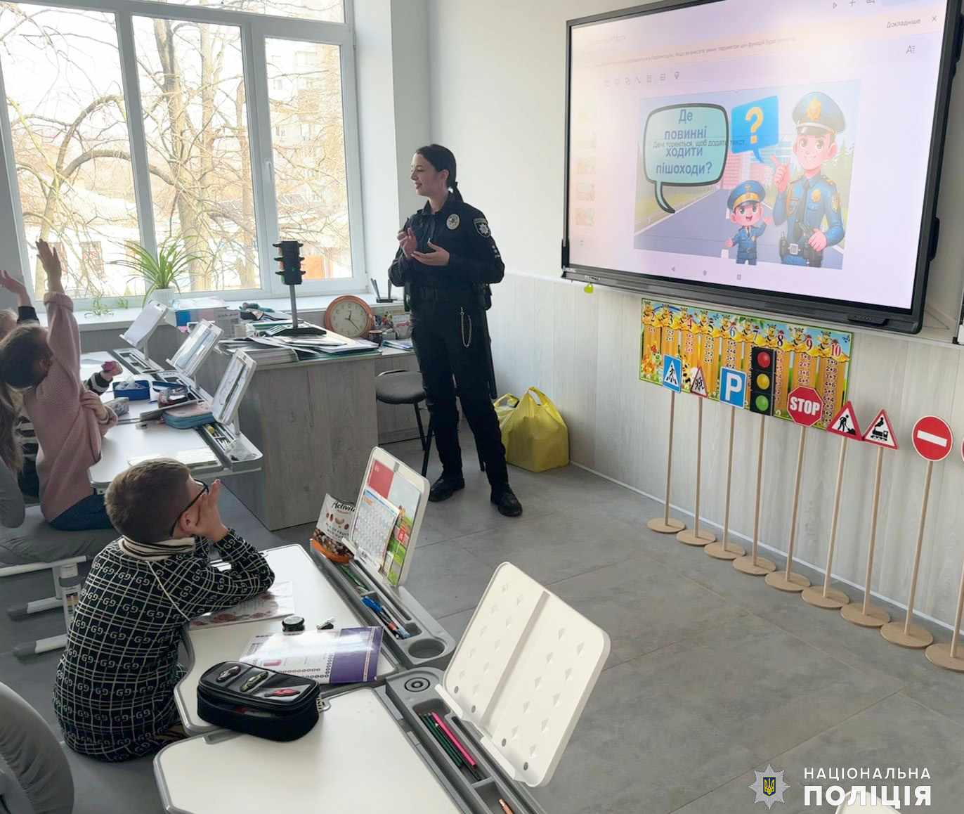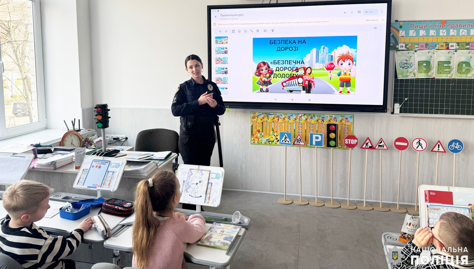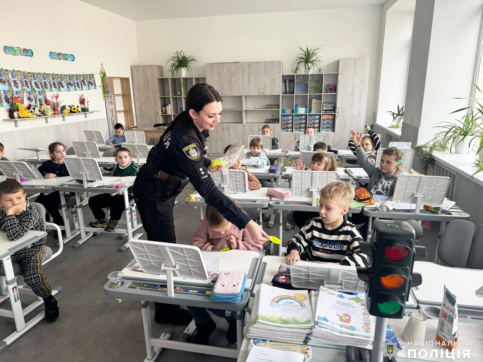 Офіцер служби освітньої безпеки Первомайського районного відділу поліції Катерина Дробко провела урок з безпеки дорожнього руху для учнів першого класу місцевої початкової школи.