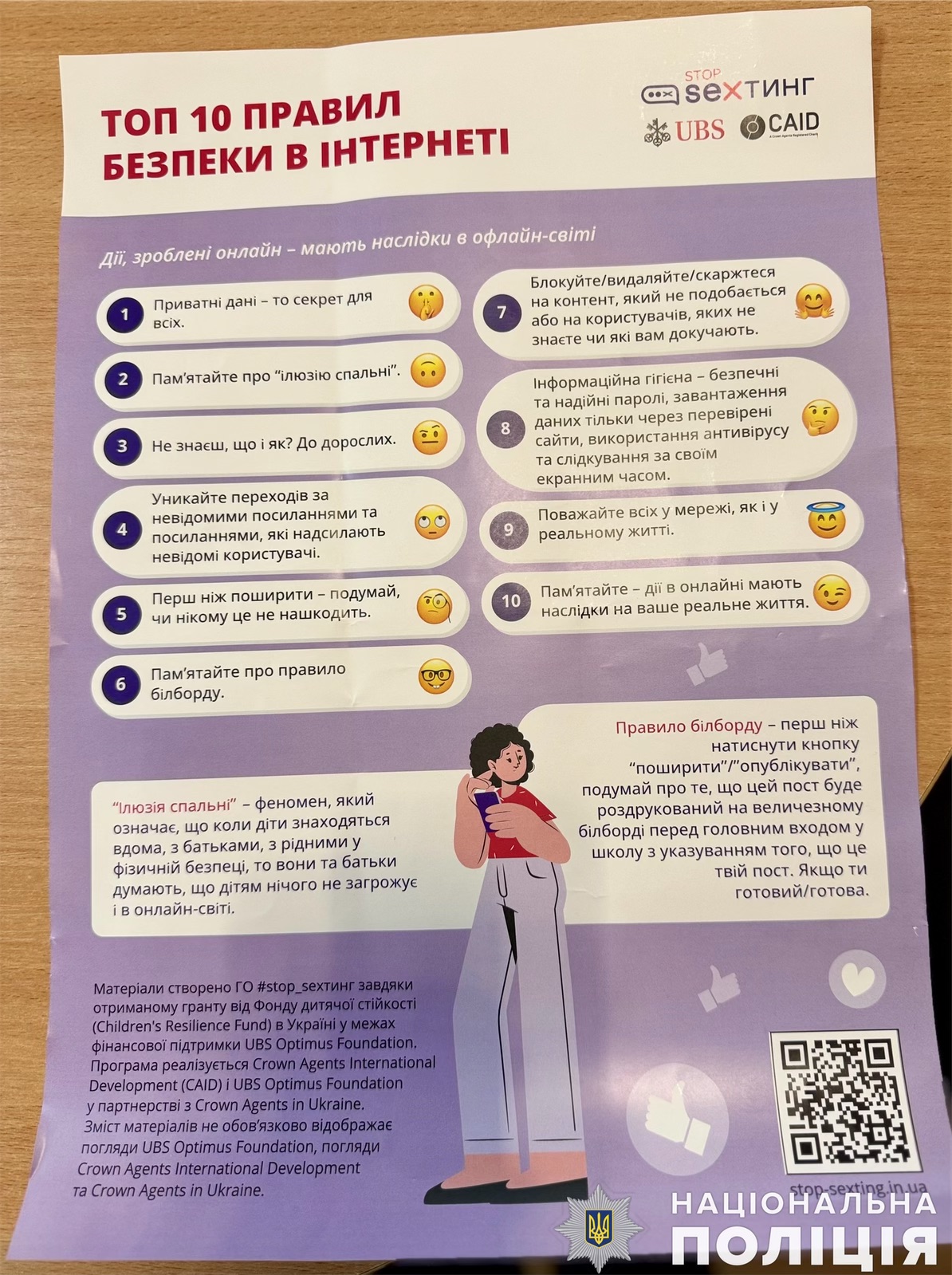 - застереження від приєднання до небезпечних інтернет-груп, які маніпулюють волею та вчинками неповнолітніх, схиляючи до вчинення злочинів і правопорушень;