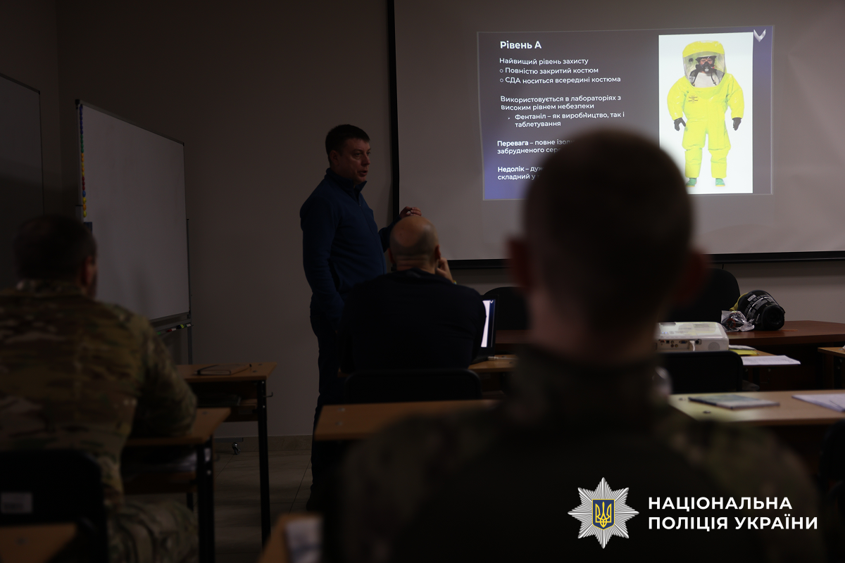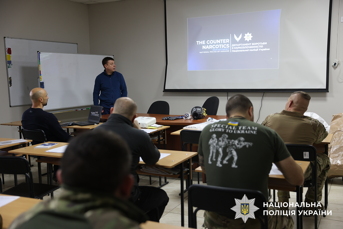 Співробітник управління боротьби з наркозлочинністю зосередив увагу бійців на сучасних загрозах, із якими стикаються правоохоронці під час виявлення та ліквідації нарколабораторій. Зокрема, йшлося про ризики можливих вибухів, хімічні небезпеки, отруєння та інші фактори, що становлять загрозу життю й здоров’ю поліцейських під час виконання службових обов’язків.