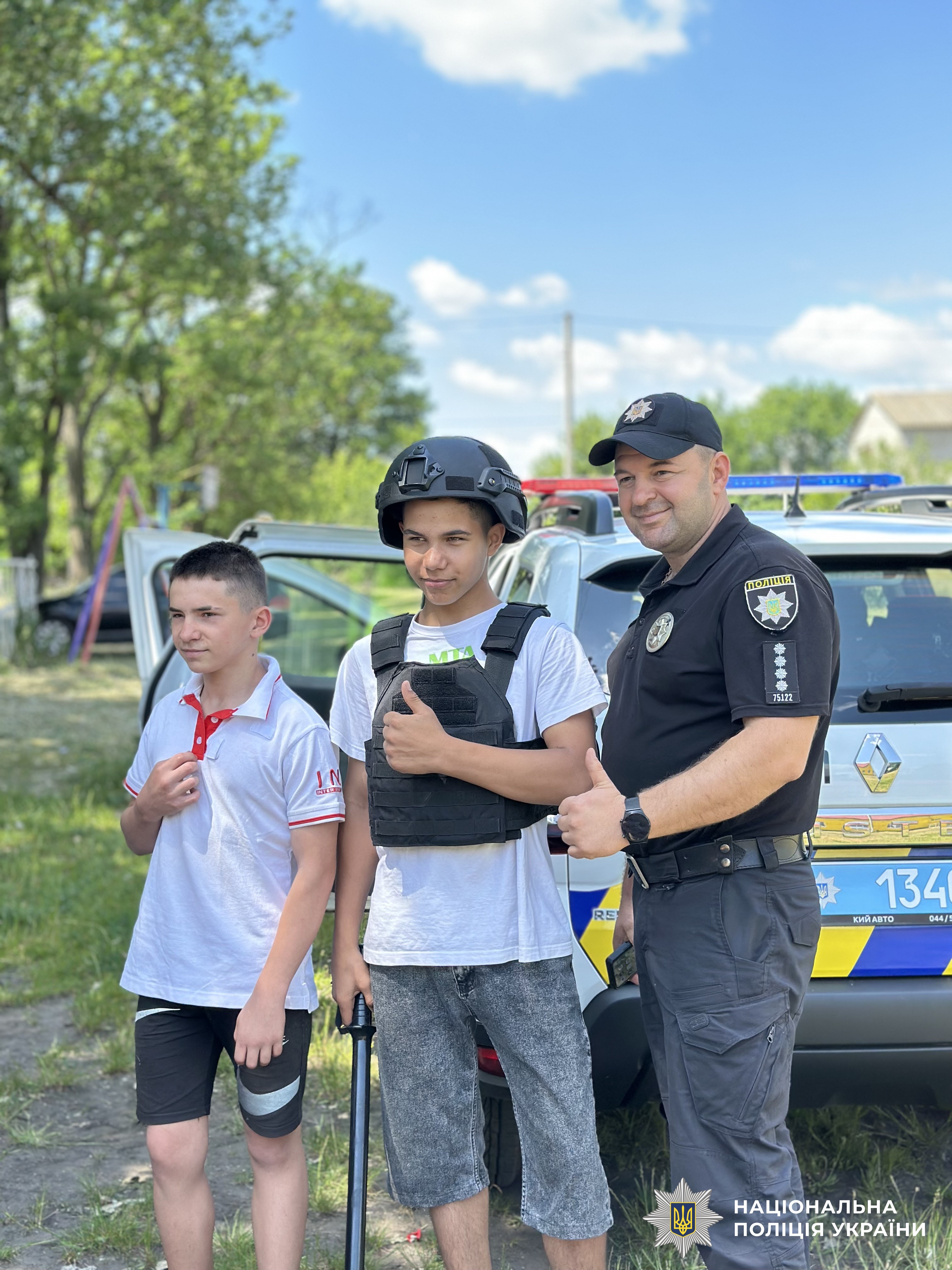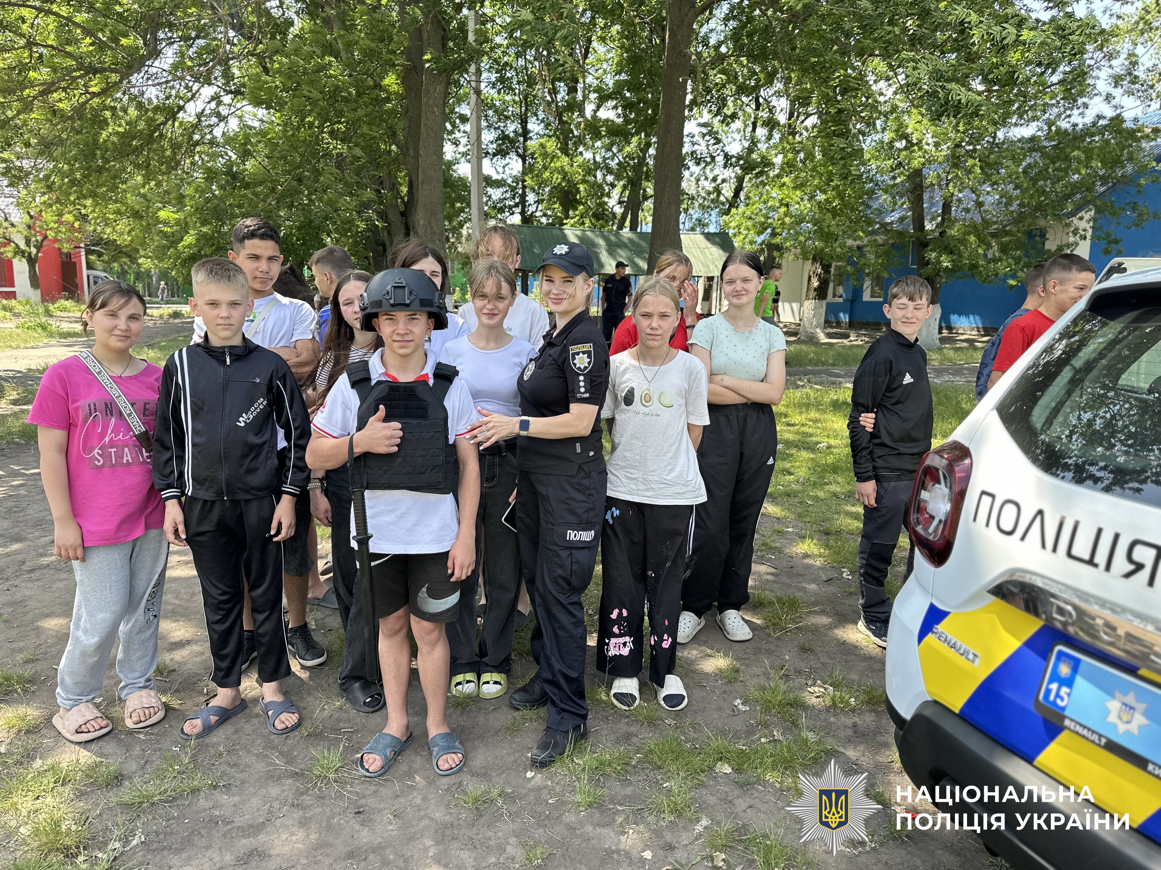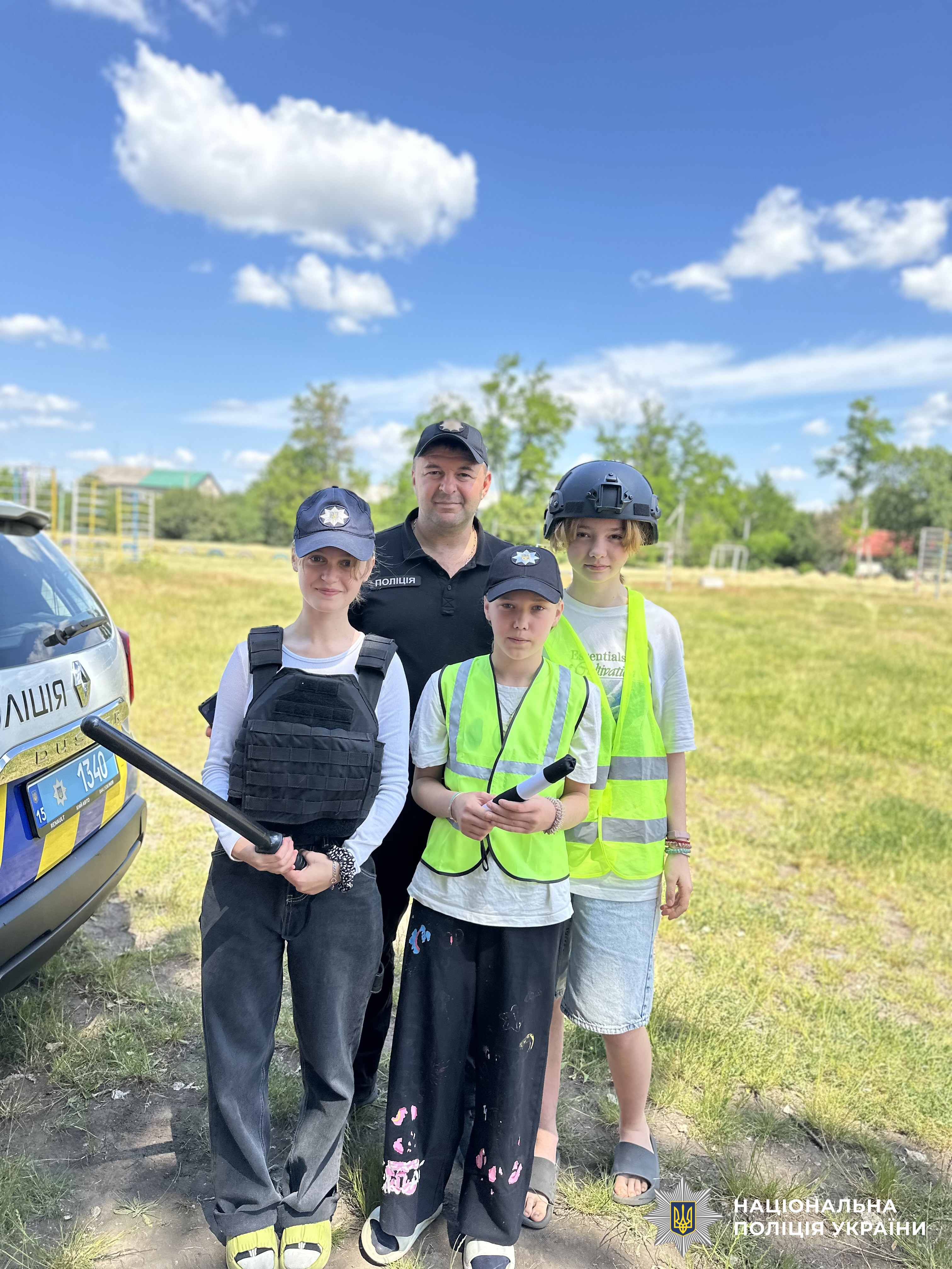 Під час заходу діти одягали засоби індивідуального захисту, мали можливість посидіти в службовому автомобілі та звернутися до однокласників за допомогою гучномовця.