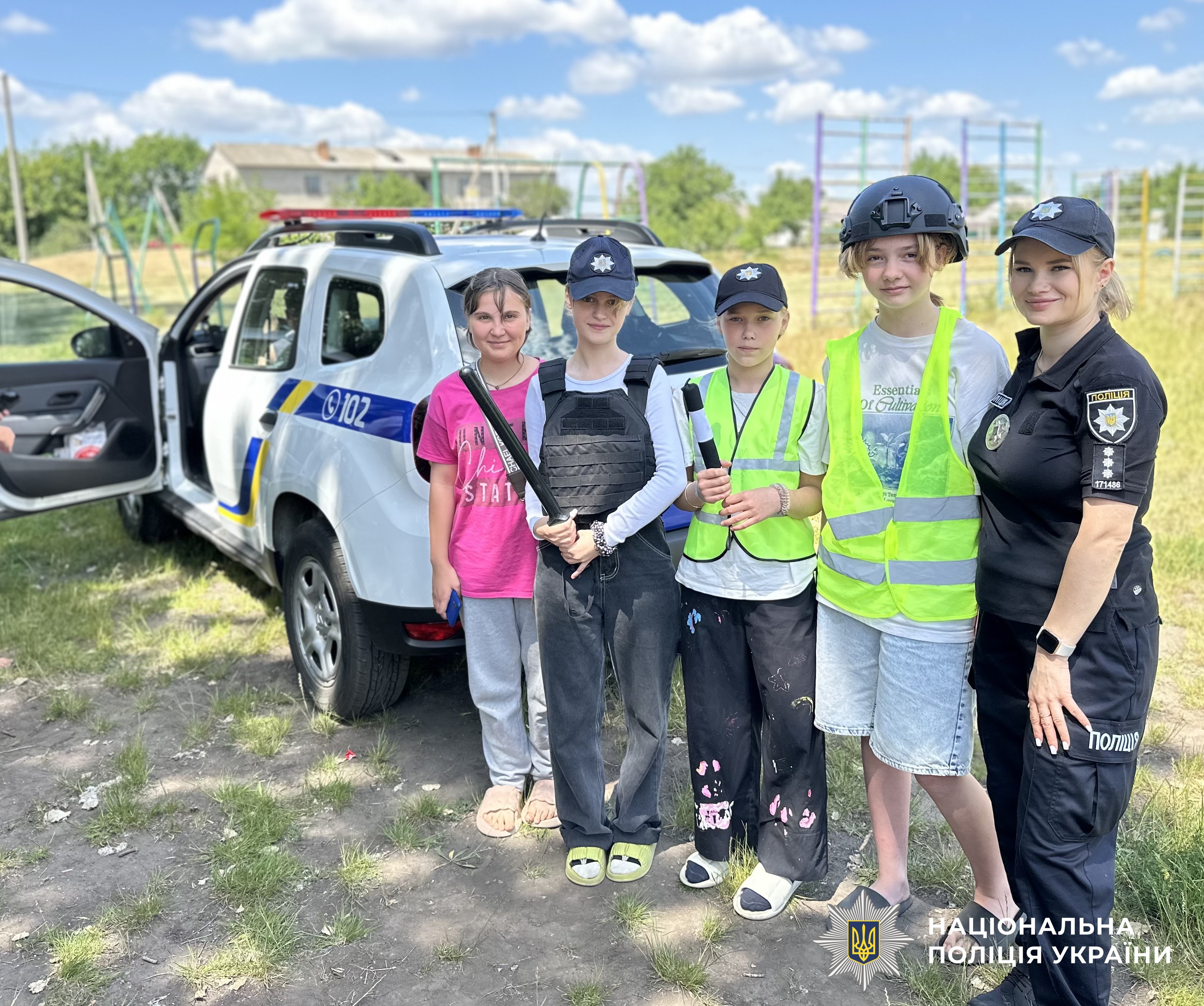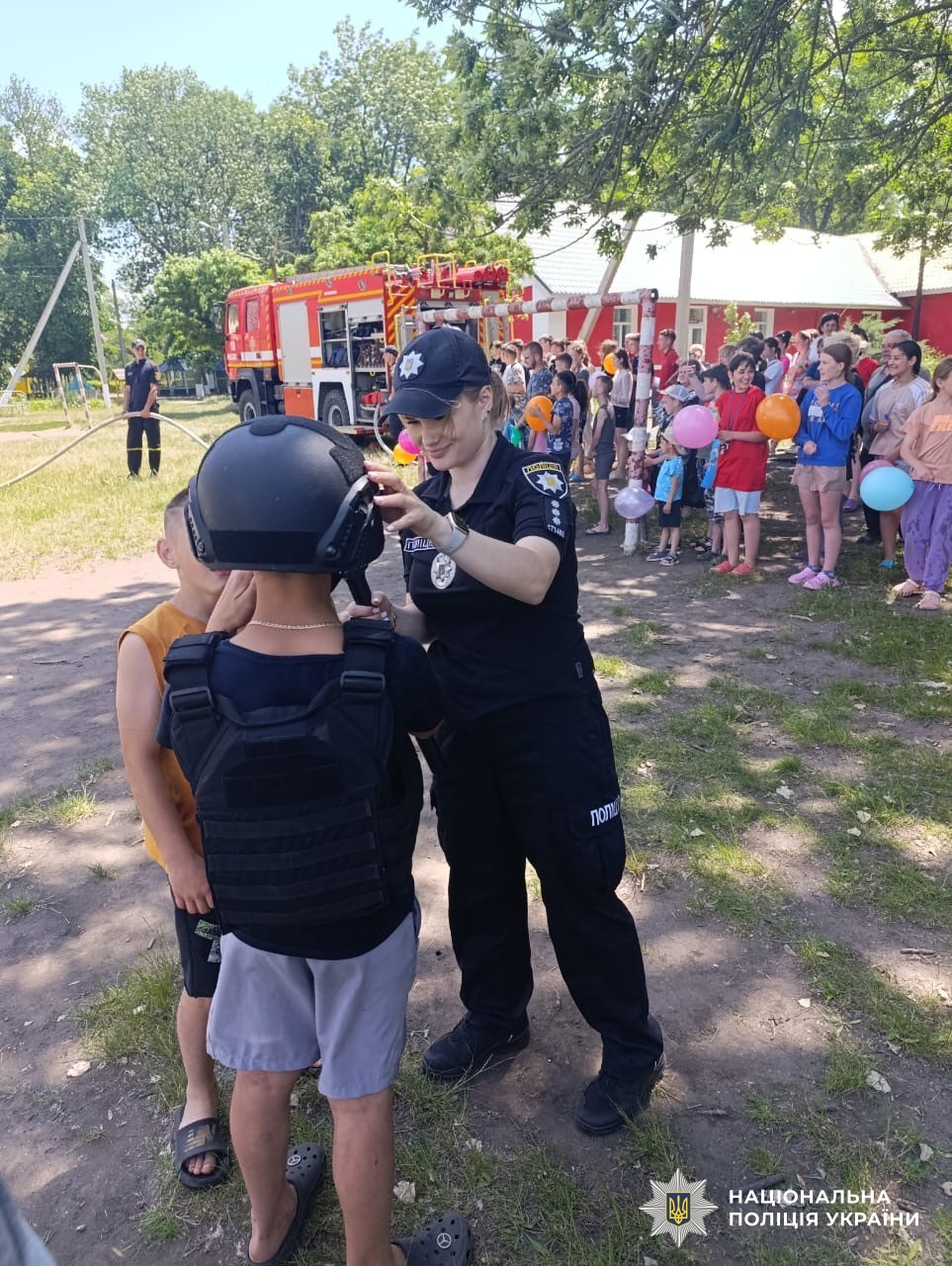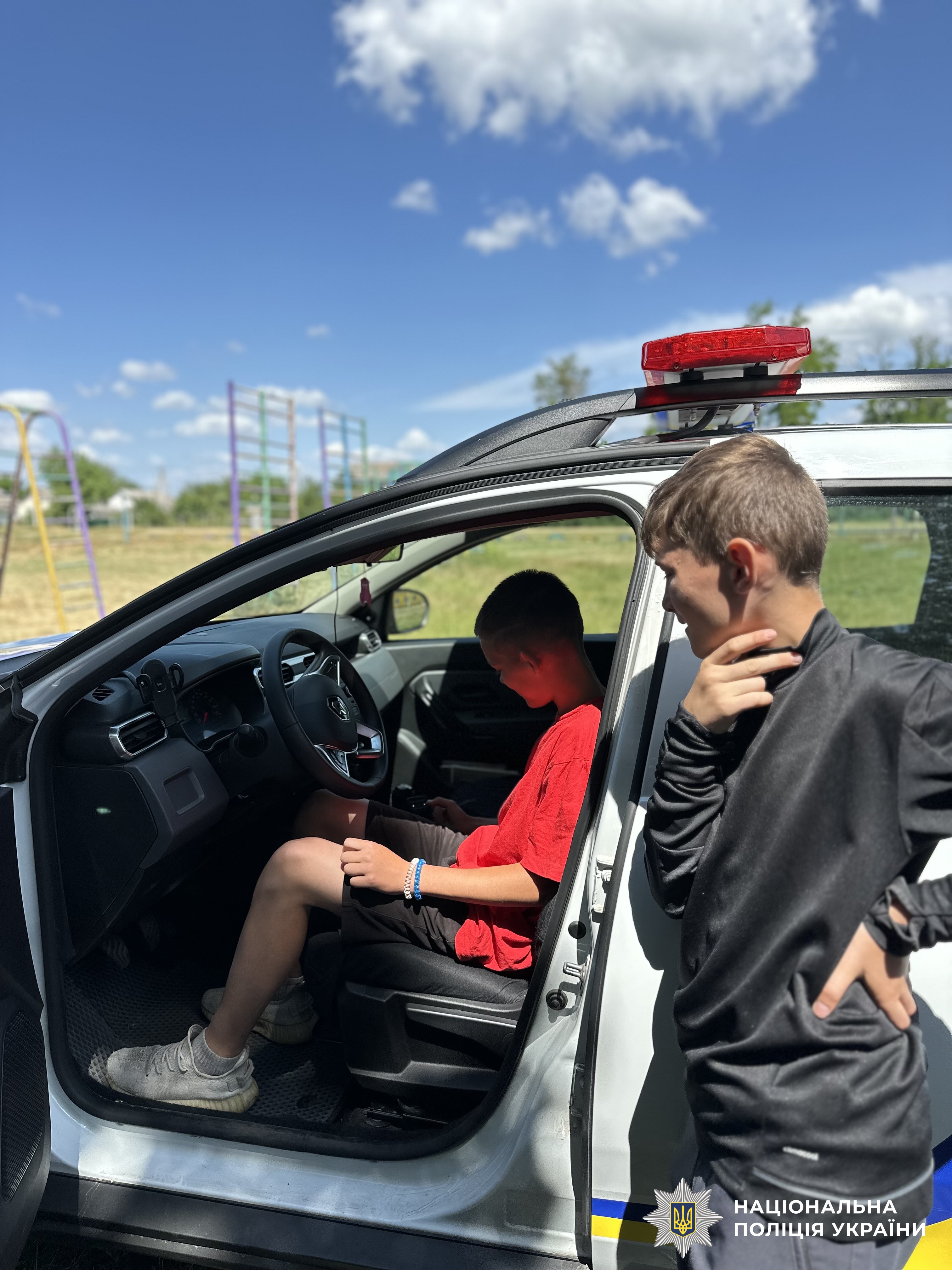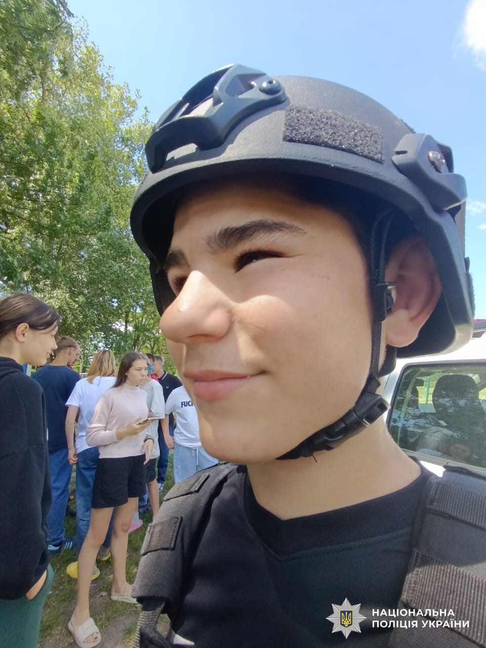 Під час заходу діти одягали засоби індивідуального захисту, мали можливість посидіти в службовому автомобілі та звернутися до однокласників за допомогою гучномовця.