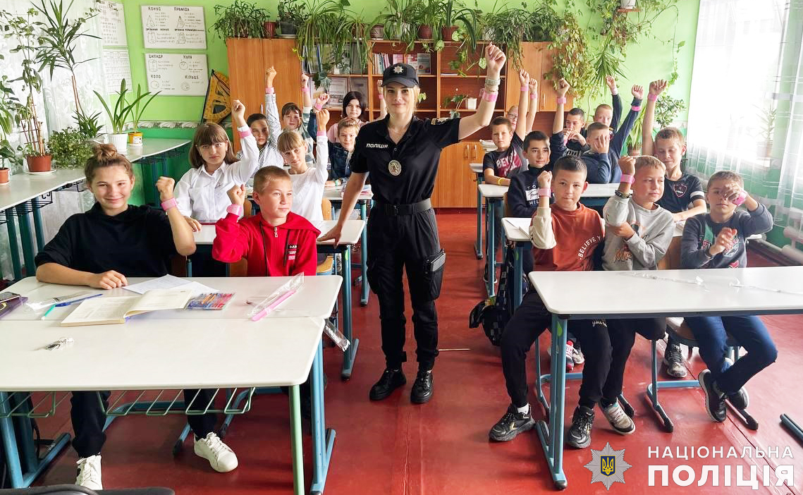 На згадку про зустріч поліцейська подарувала дітям люмінесцентні браслети, які мають допомогти їм стати більш помітними у темряві, а водіям – завчасно побачити дітей на дорозі.