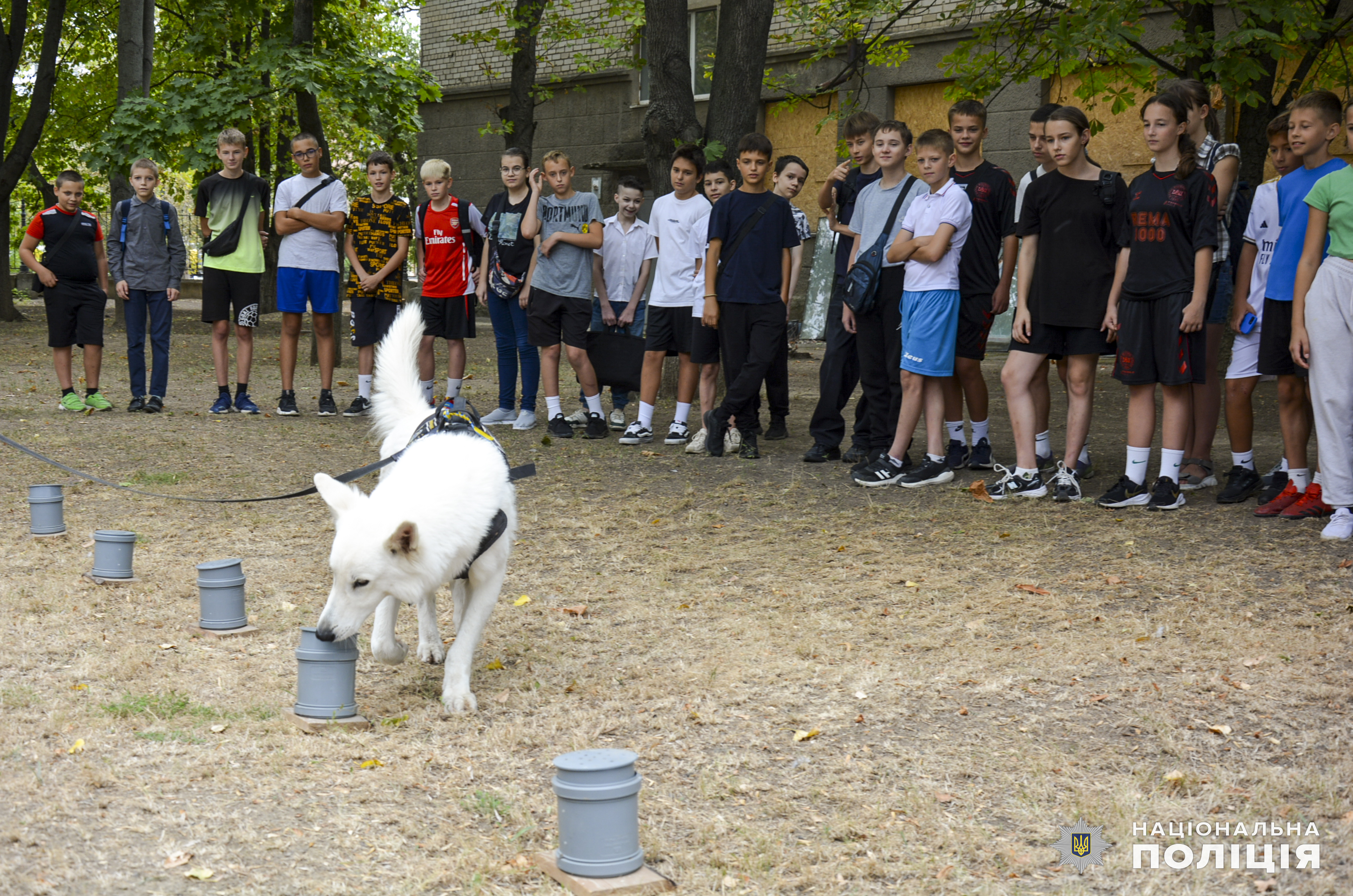 Кілька пізнавальних локацій, де можна було не тільки повчитись, але й безпосередньо взяти участь у пошуку небезпечних предметів, поміряти захисне спорядження правоохоронців та побачити як службові собаки шукають наркотичні речовини. Сьогоднішній урок для учнів середніх та старших класів миколаївського спортивного ліцею проводили виключно поліцейські та фахівці ДСНС.