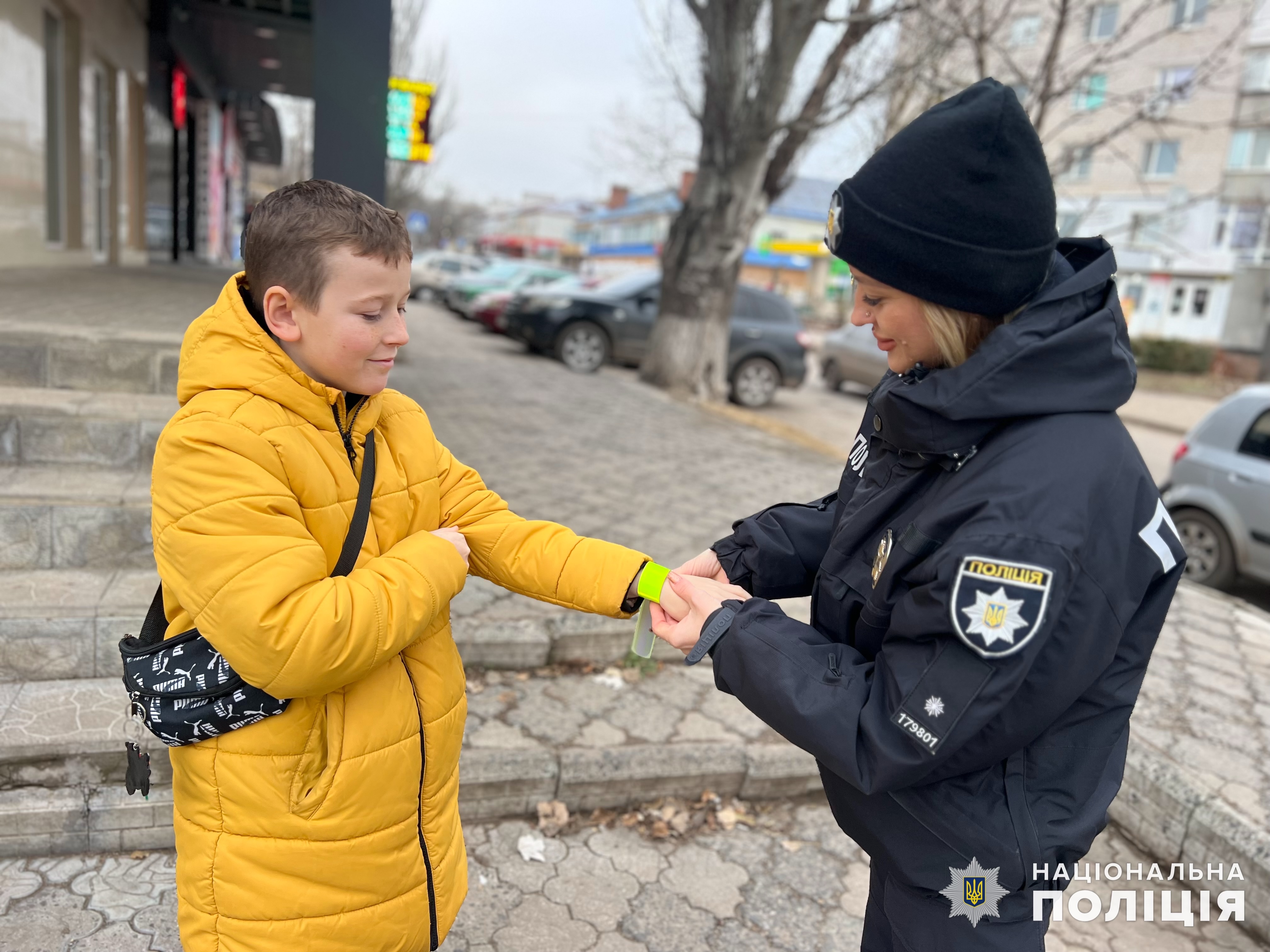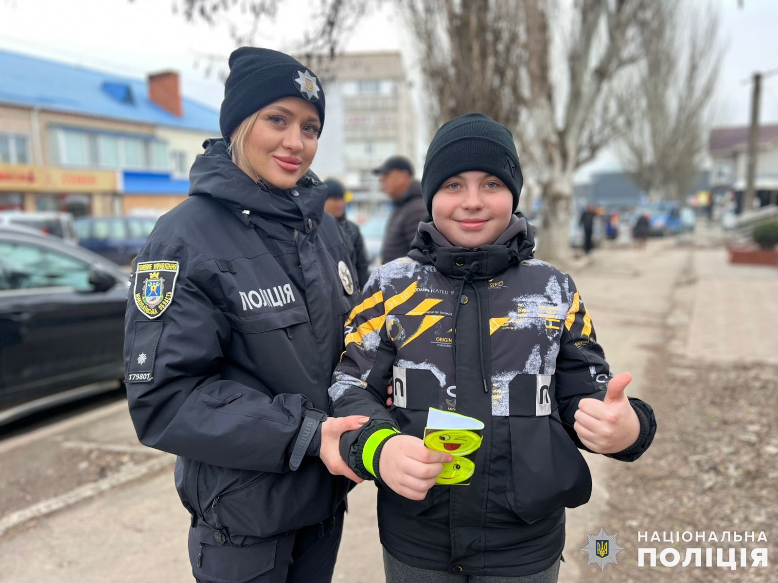 Безпека у темряві: у Баштанці поліцейські навчали дітей правил безпечного руху на вулиці та дарували світловідбиваючі флікери