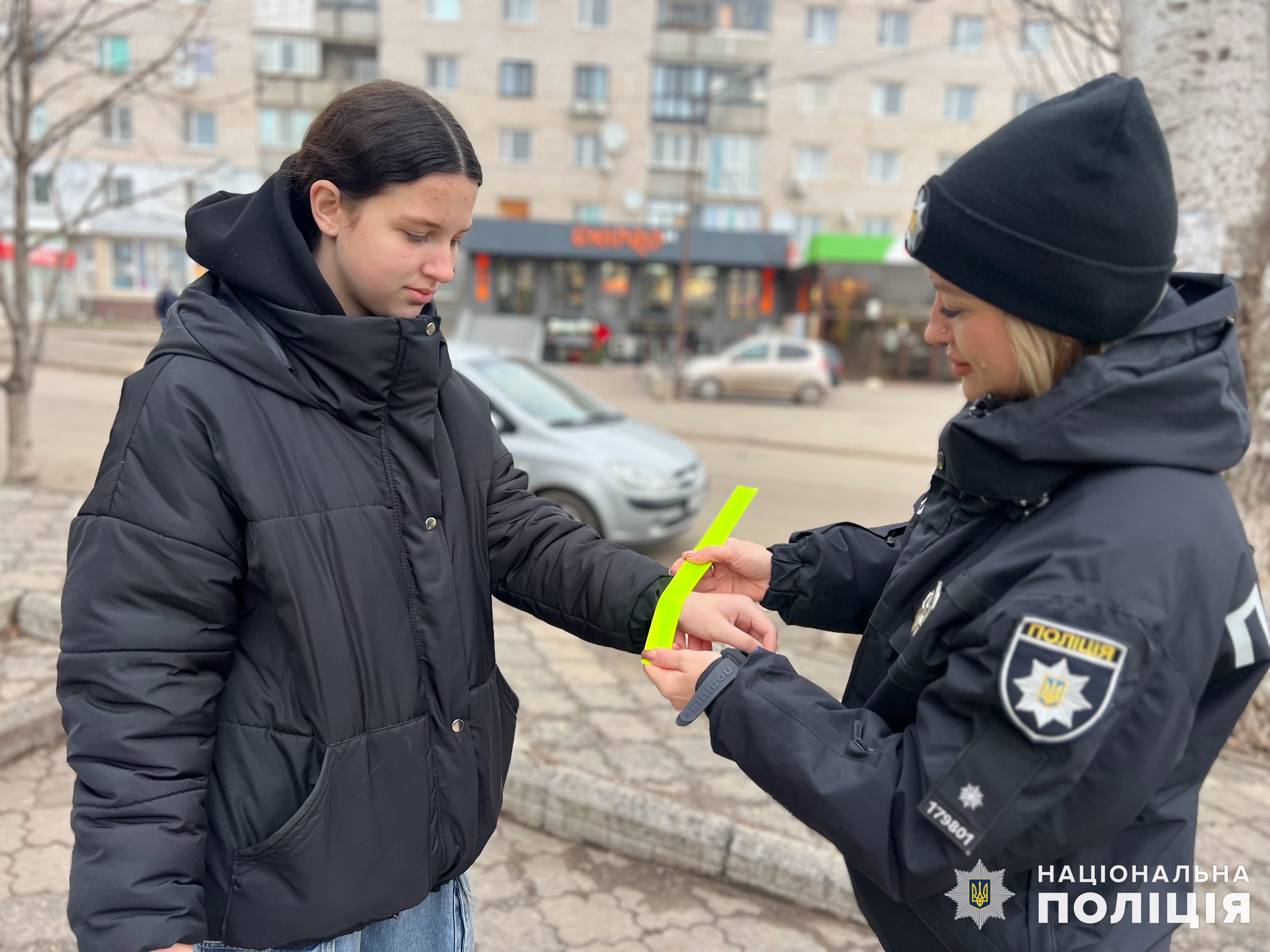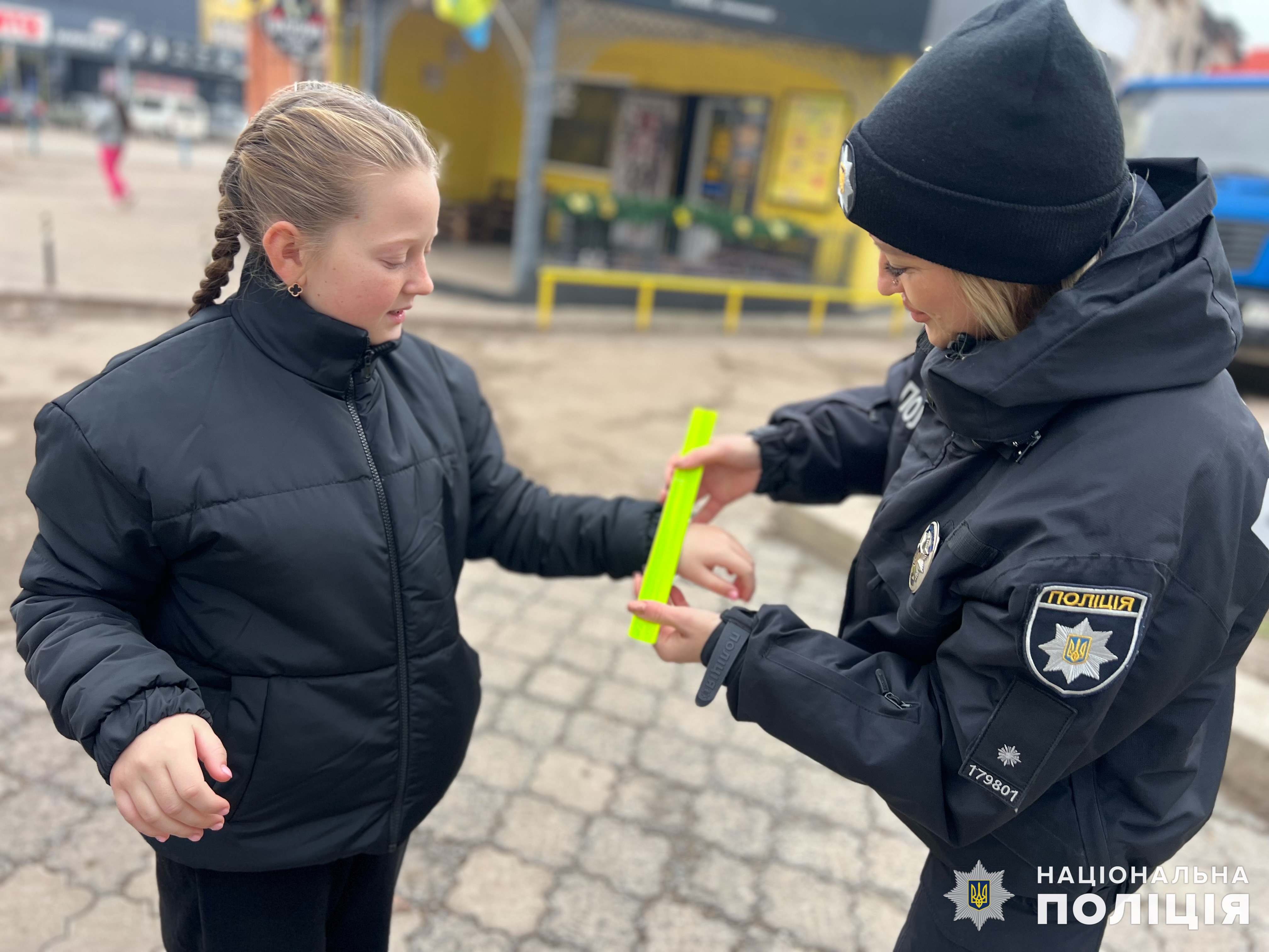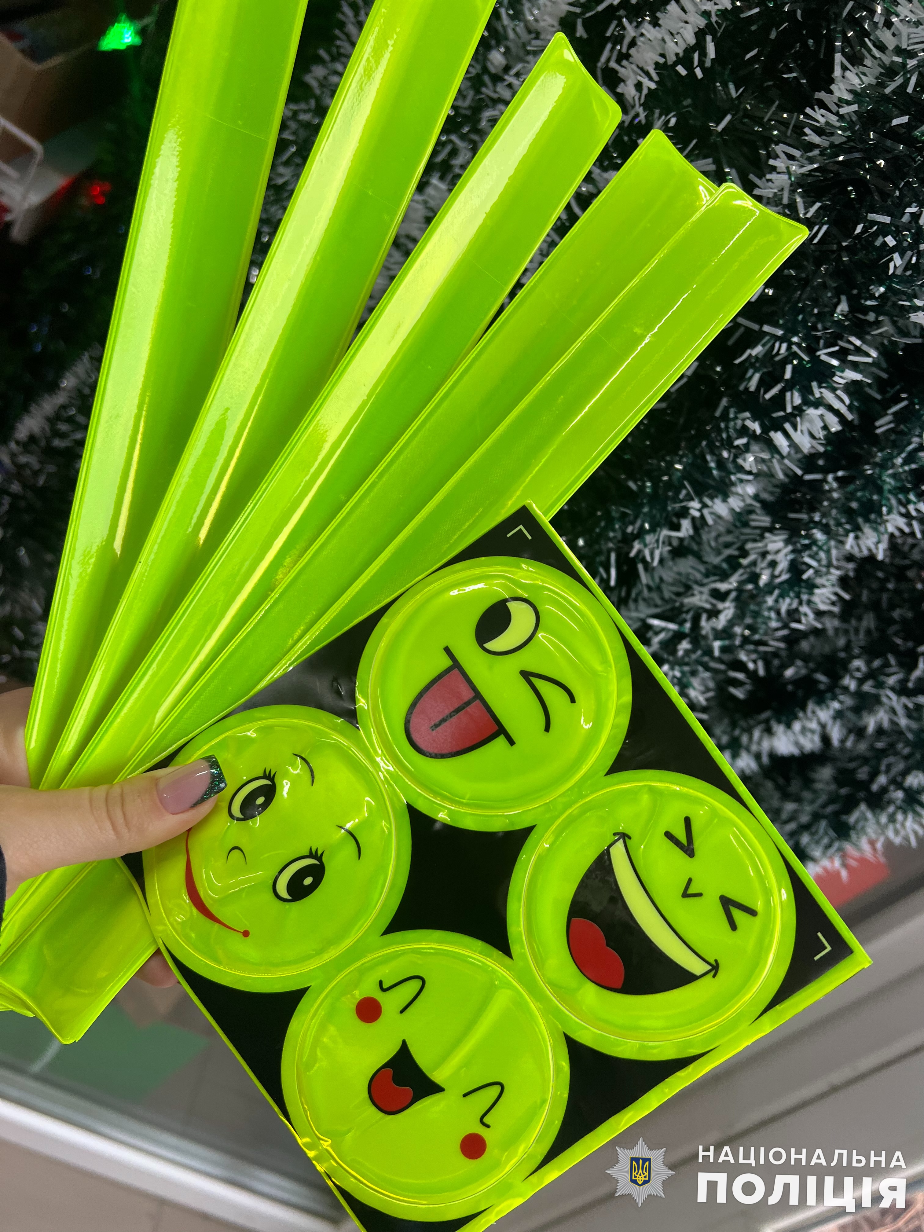 Правоохоронці дарували дітям світловідбиваючі наліпки-смайлики та браслети, які роблять юних пішоходів помітнішими для водіїв і допомагають уникнути небезпеки на дорозі.
