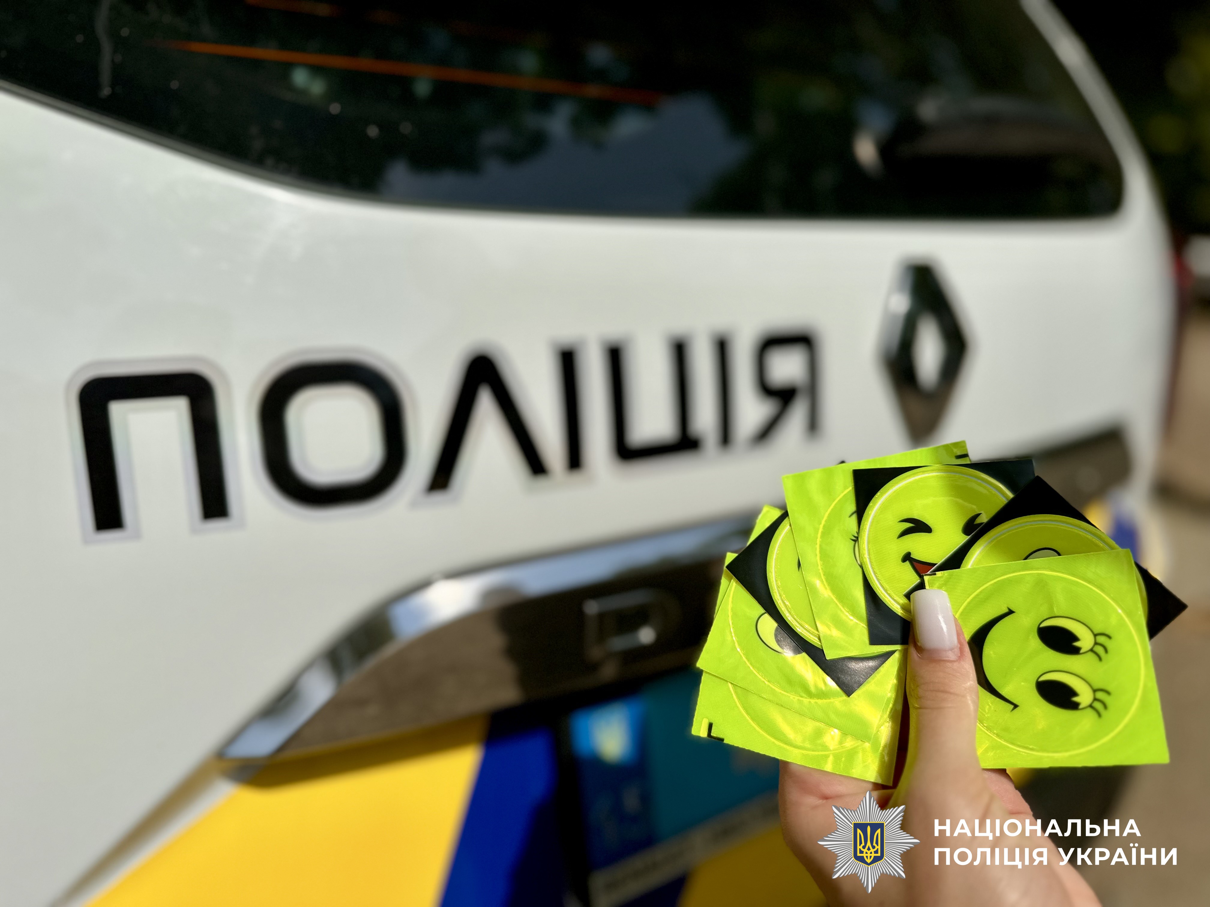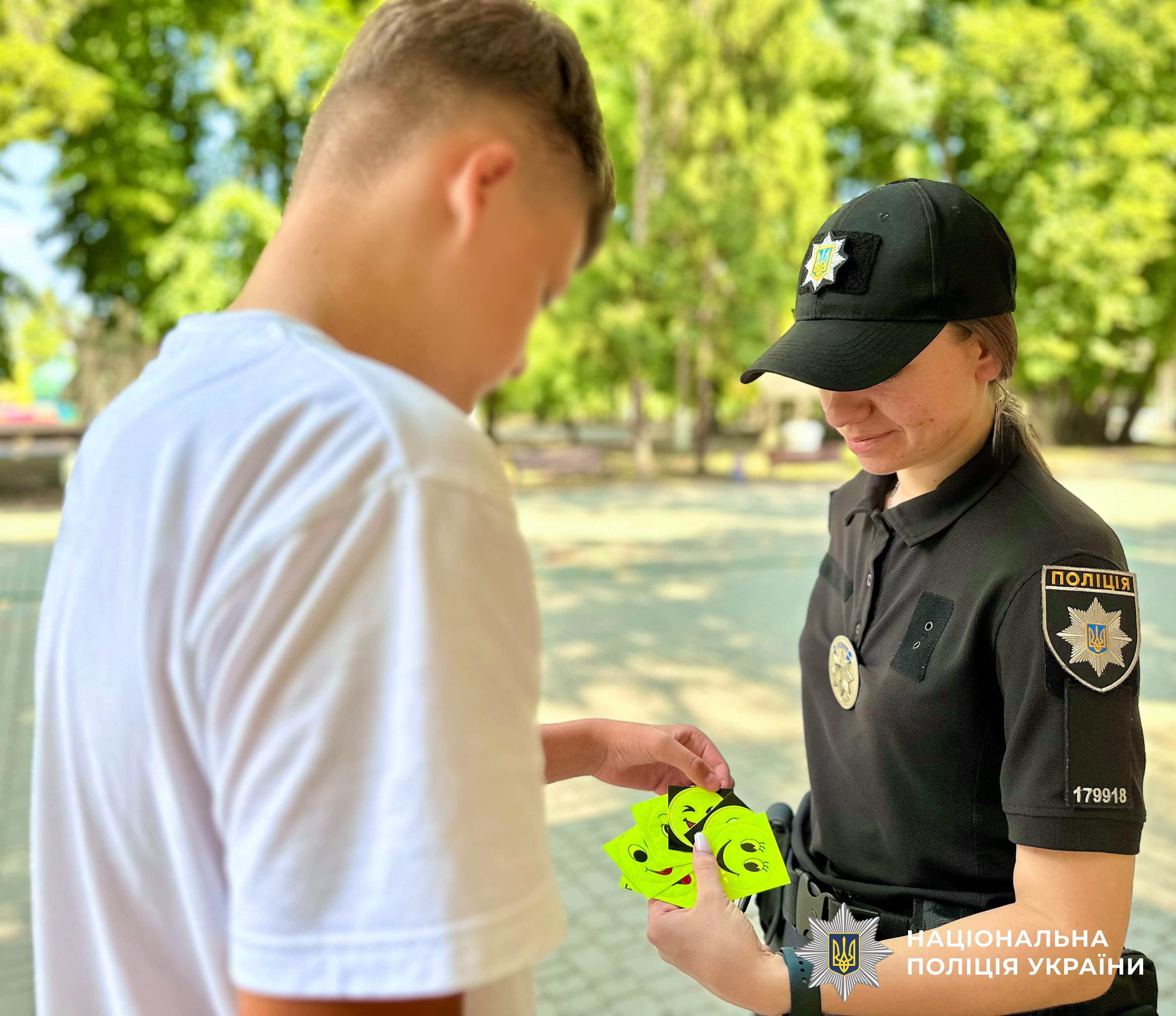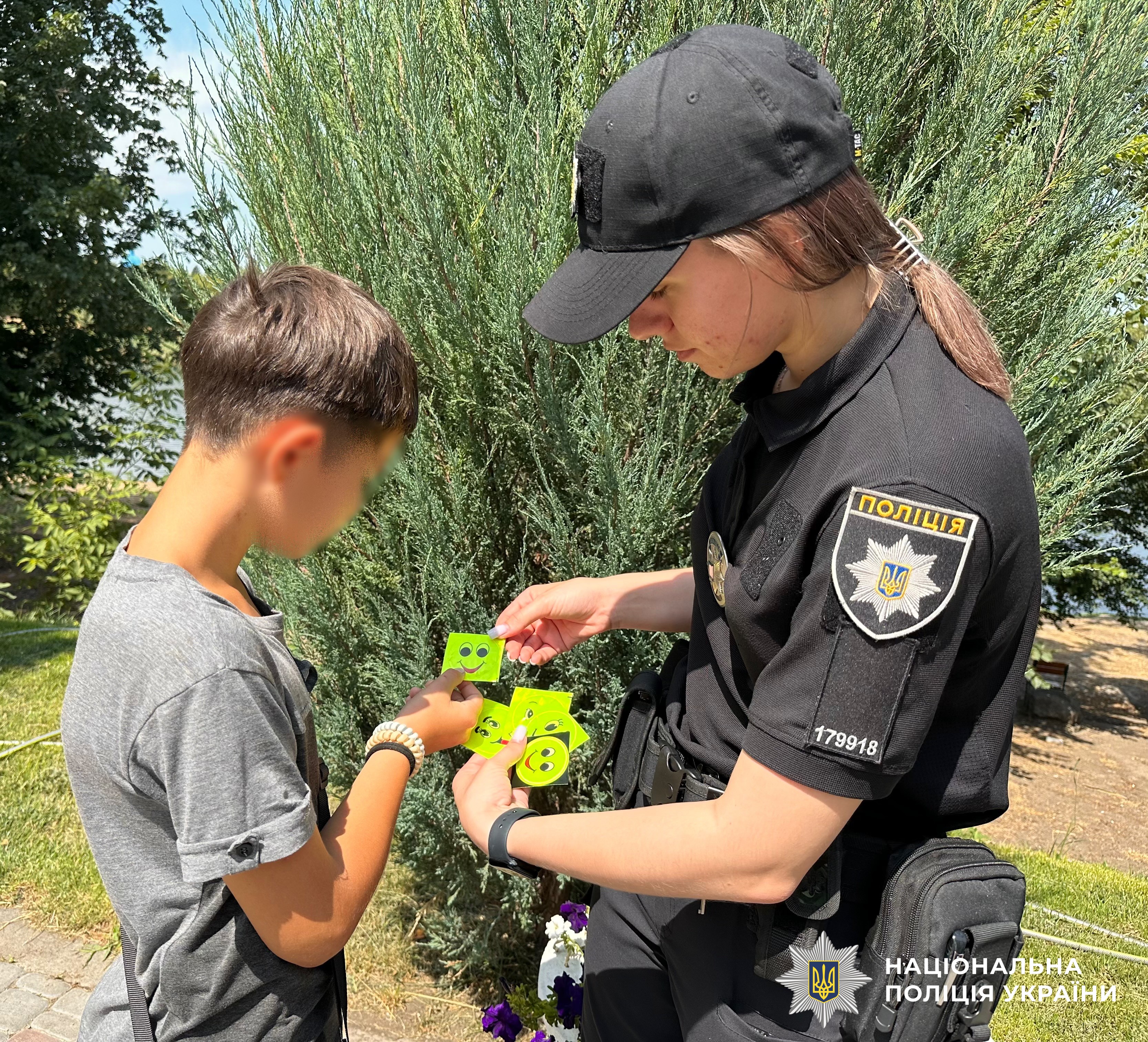 Поліцейська подарувала юним співрозмовникам флікери-смайлики, які засвітять їх у темряві та вбережуть від травмувань під час пересування на дорогах.