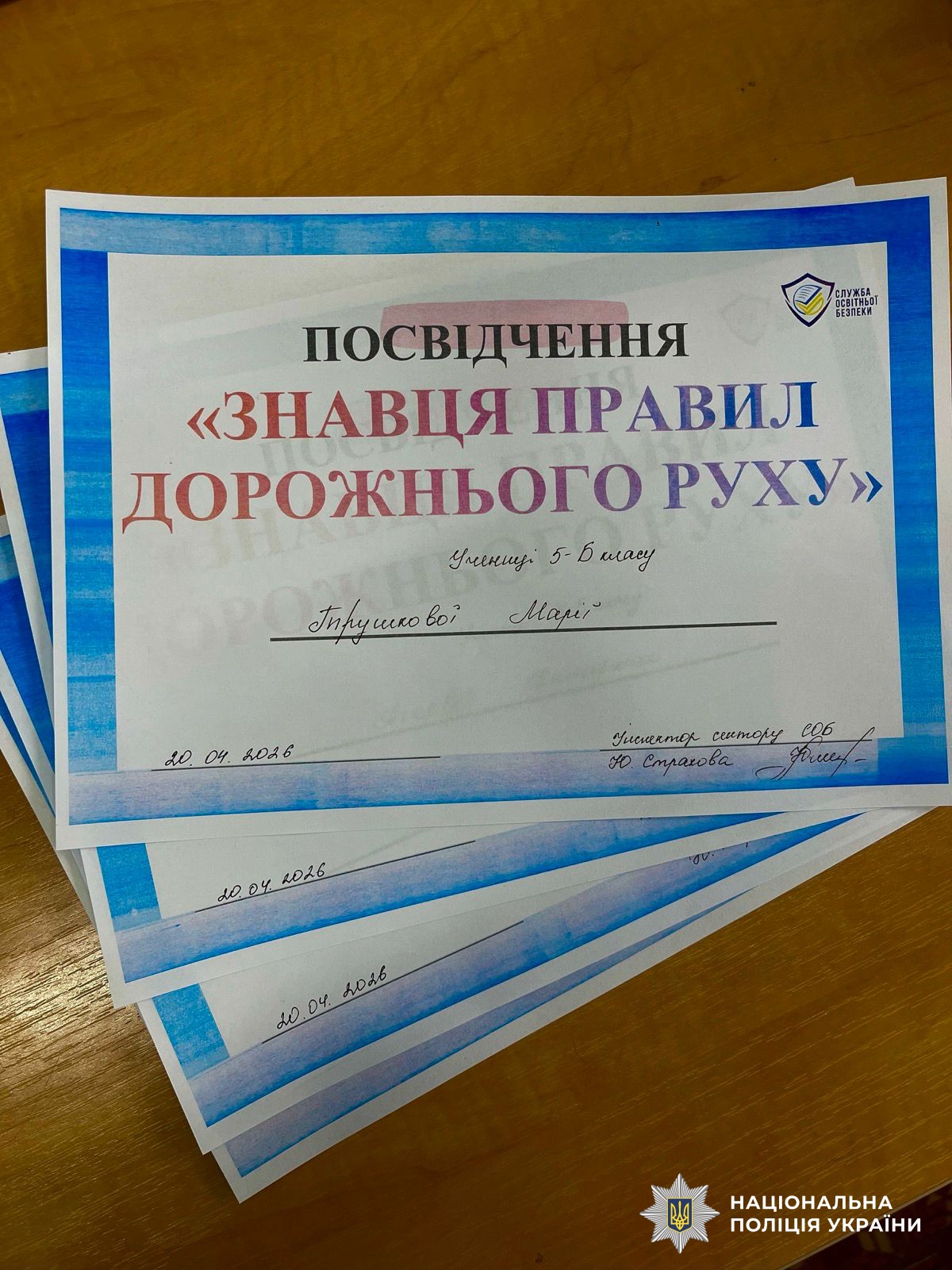Наприкінці зустрічі інспекторка наголосила, що відповідальне ставлення до правил дорожнього руху формує культуру безпечної поведінки з раннього віку. Також поліцейська вручила дітям посвідчення знавців правил дорожнього руху як відзнаку за активну участь і засвоєні знання.