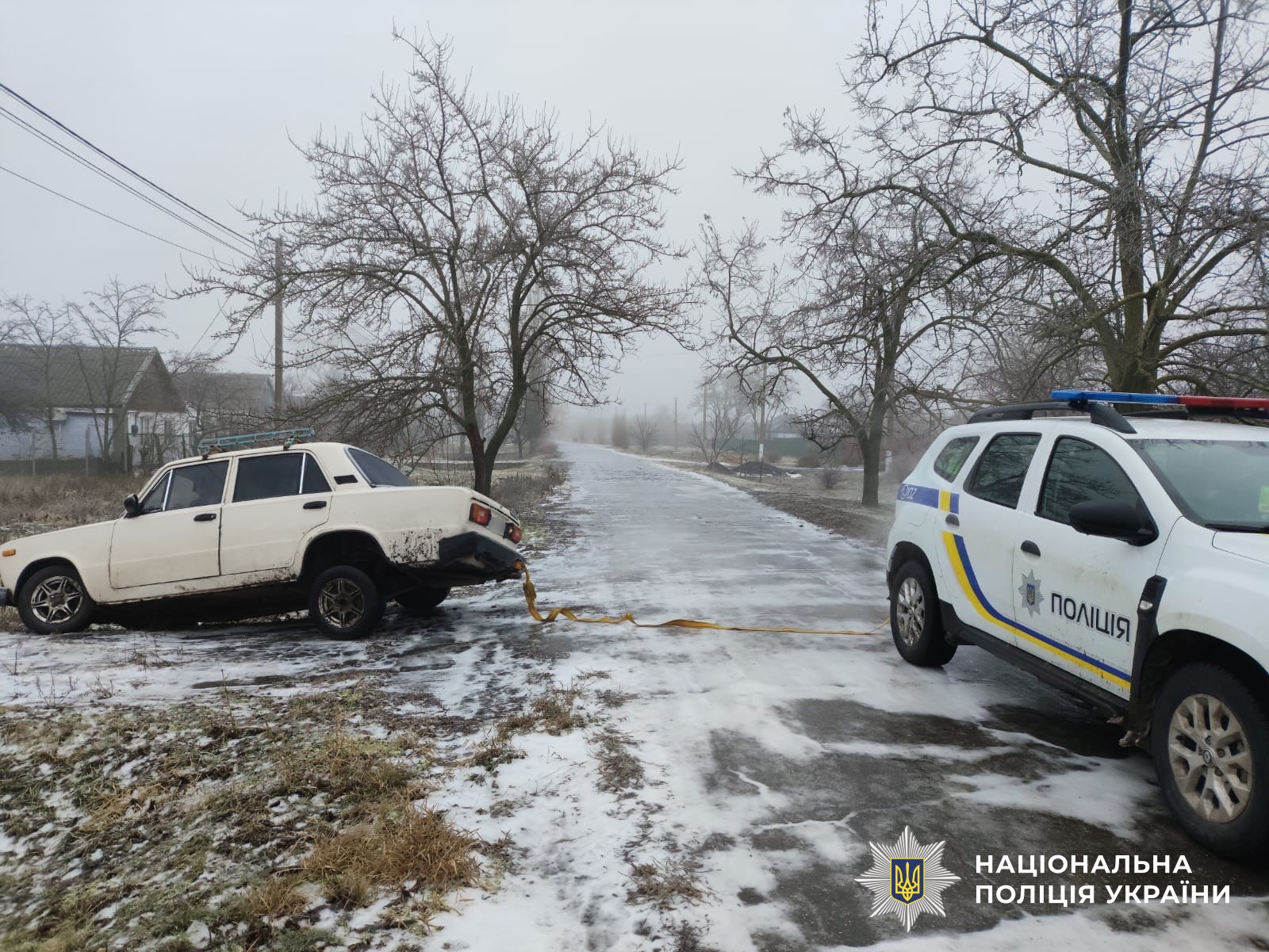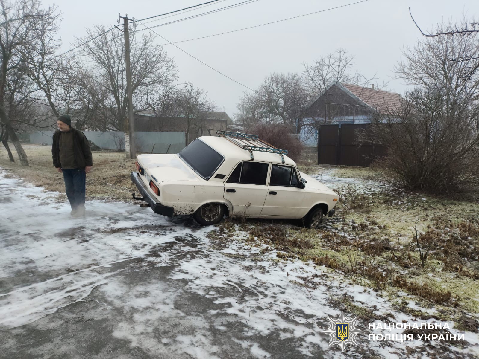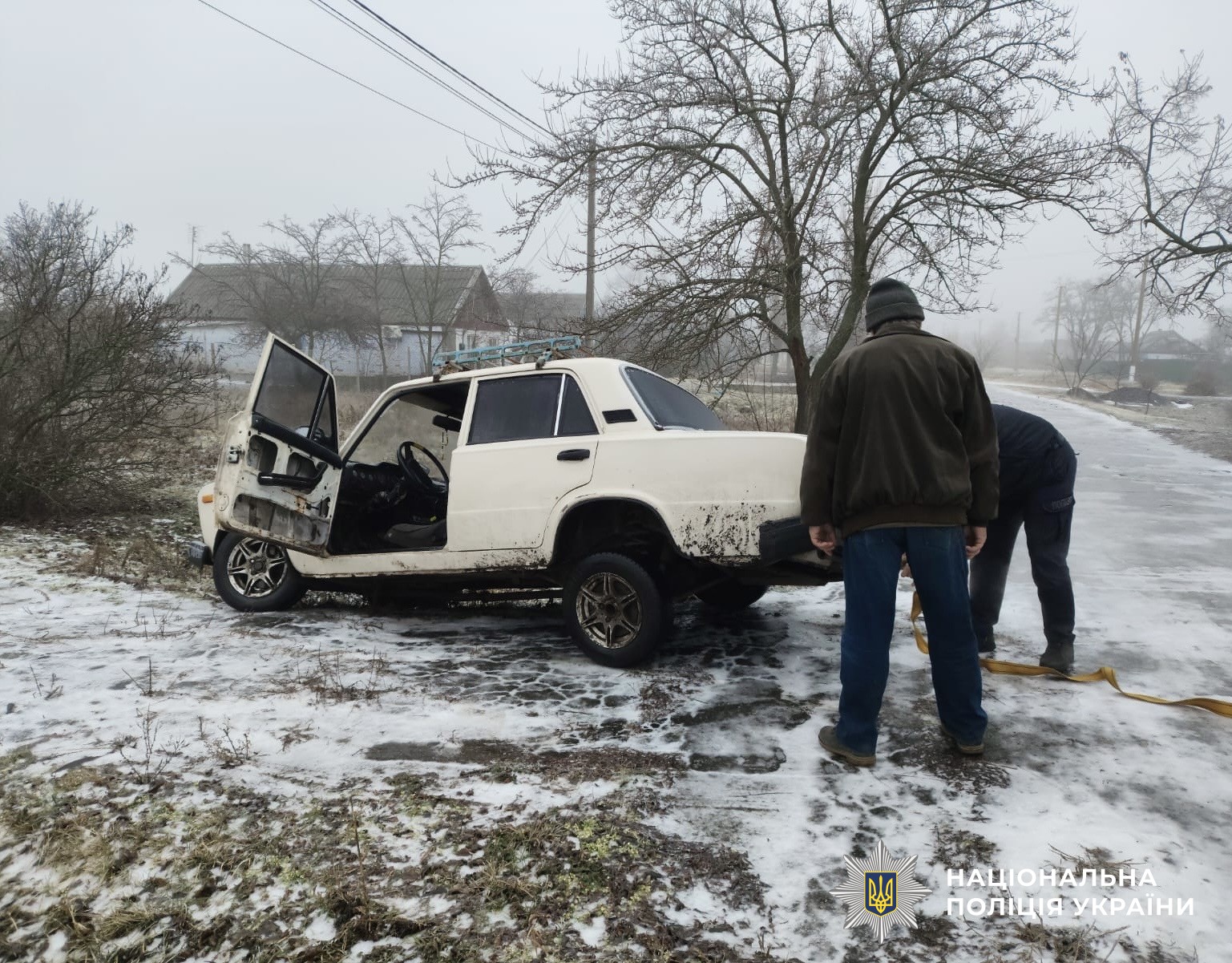 Під час чергового патрулювання Новобузької громади поліцейський офіцер громади виявив легковий автомобіль ВАЗ 2106, водій якого через слизьке дорожнє покриття з’їхав із проїзної частини у кювет. За допомогою буксирування транспортний засіб було безпечно повернуто на проїзну частину. Унаслідок події ніхто не постраждав, автомобіль суттєвих механічних пошкоджень не зазнав. Водій подякував поліцейському за надану допомогу, після чого кожен продовжив рух.