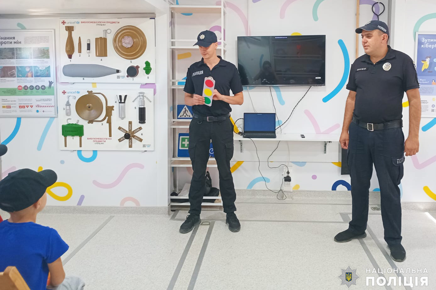 Під час уроку поліцейські розповіли дітям значення дорожніх знаків, що регулюють рух пішоходів, нагадали як поводитися поблизу автодороги, особливо на велосипедах та самокатах.