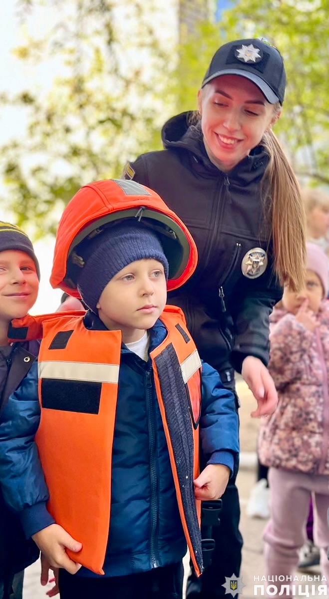 Особливу увагу правоохоронці звернули на алгоритм дій під час сигналу «Повітряна тривога» та провели разом із дітьми навчально-тренувальні евакуаційні заходи, під час яких одягли малечі засоби особистого захисту – бронежилети і каски та вчились рухатись в укриття у разі небезпеки.