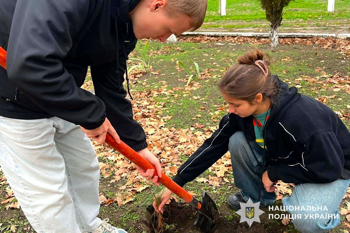 Екологічна акція з офіцером громади: на Вознесенщині підлітки разом з поліцейським висадили хвойні дерева