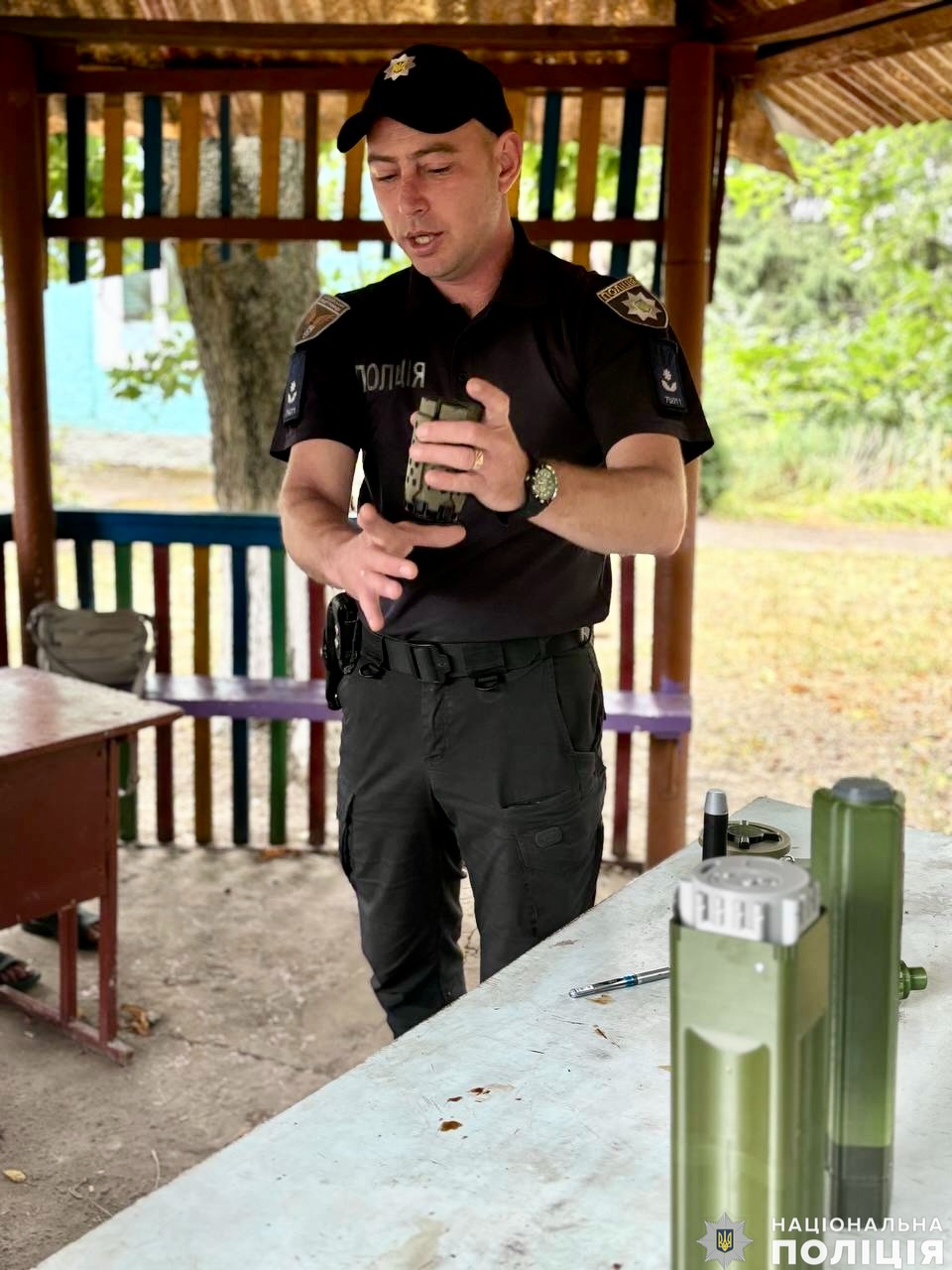 Під час заняття шериф поліції розповів про правила поводження при виявленні вибухонебезпечних чи підозрілих предметів. Поліцейський акцентував увагу дітей, якщо виявили невідомий предмет, забороняється брати його до рук, розбирати, кидати в полумʼя, проводити з ним будь-які механічні дії, що можуть призвести до вибуху. На прикладі макетів поліцейський показав школярам як можуть виглядати вибухові снаряди та яку небезпеку вони становлять.