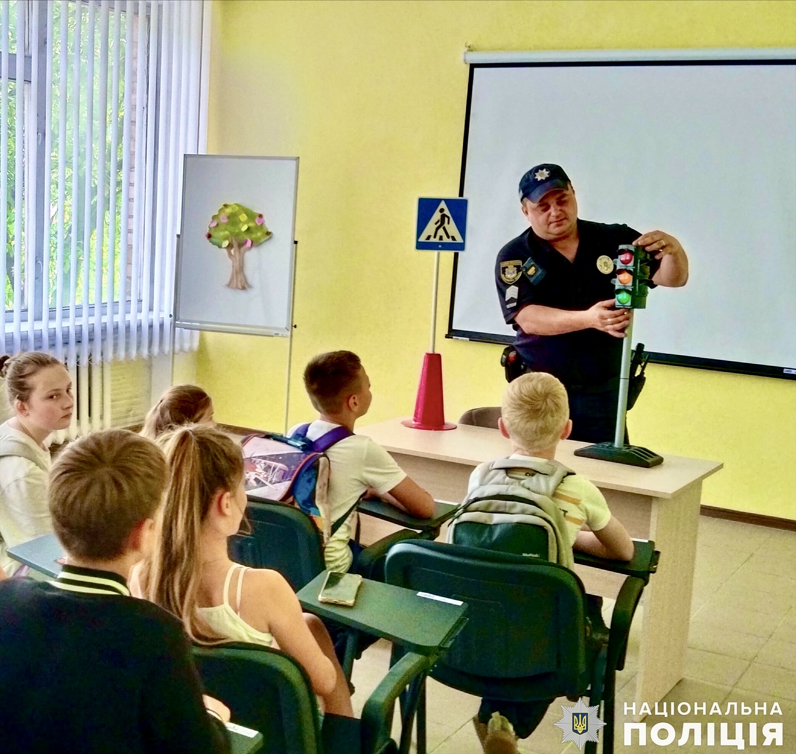 Спілкуючись зі школярами, поліцейський розповів їм що означають і про що попереджають сигнали світлофора та основні дорожні знаки, нагадав правила безпечного перетину проїзної частини дороги, перехресть та нерегульованих пішохідних переходів.