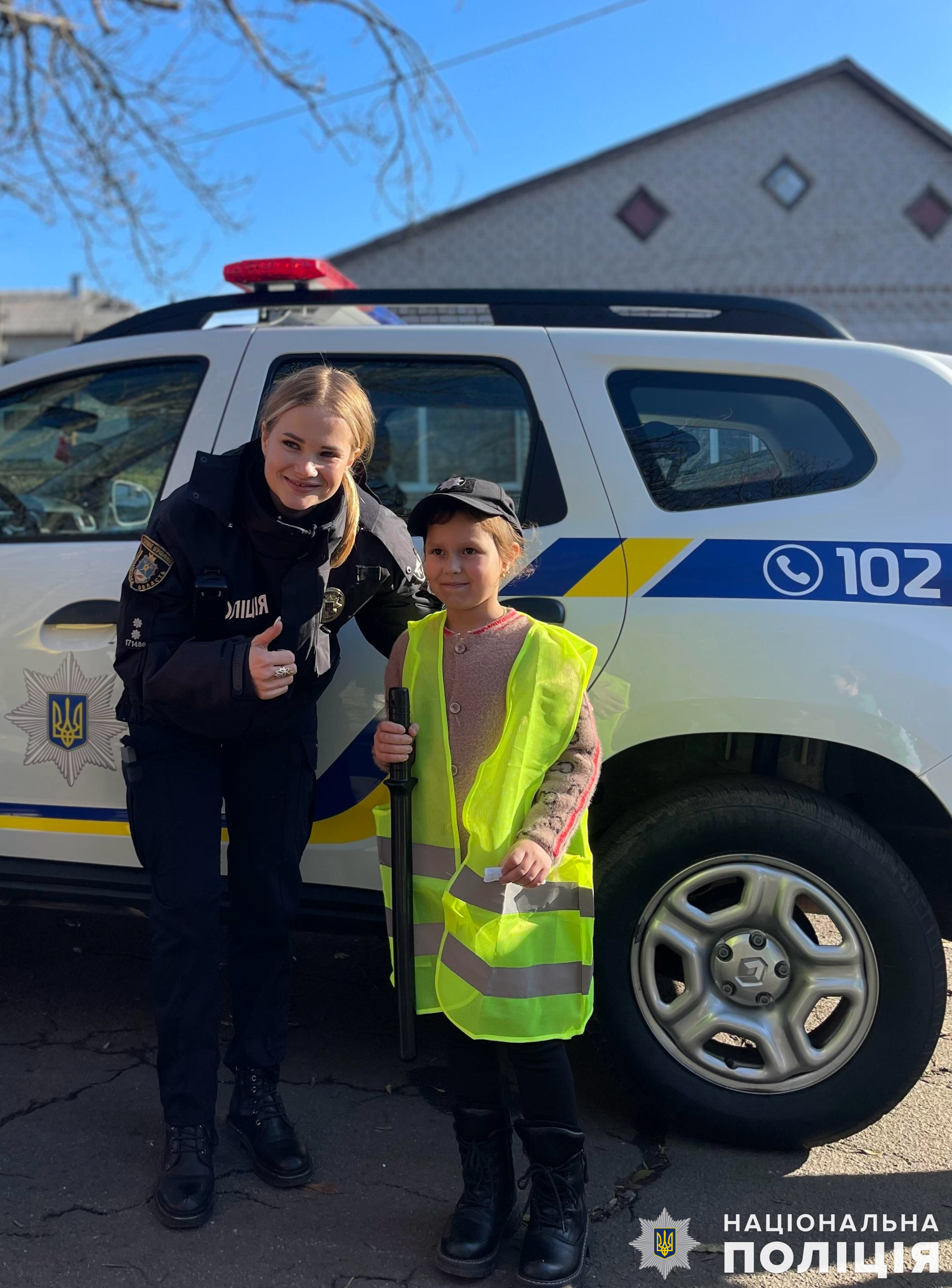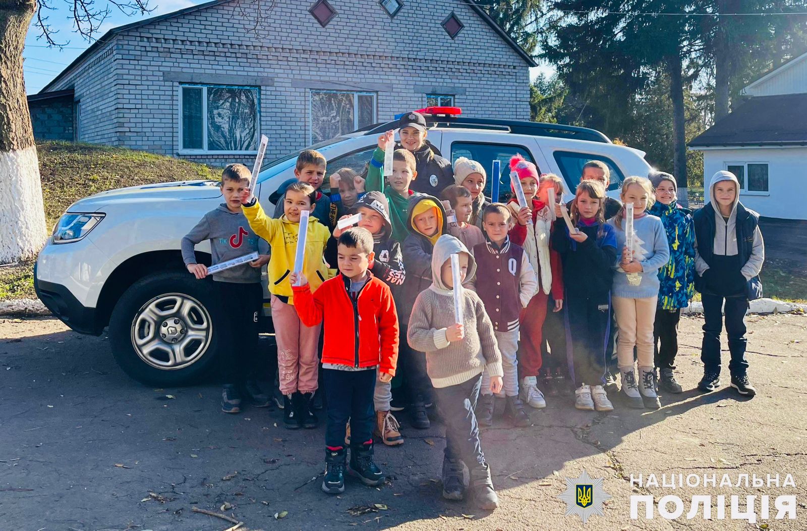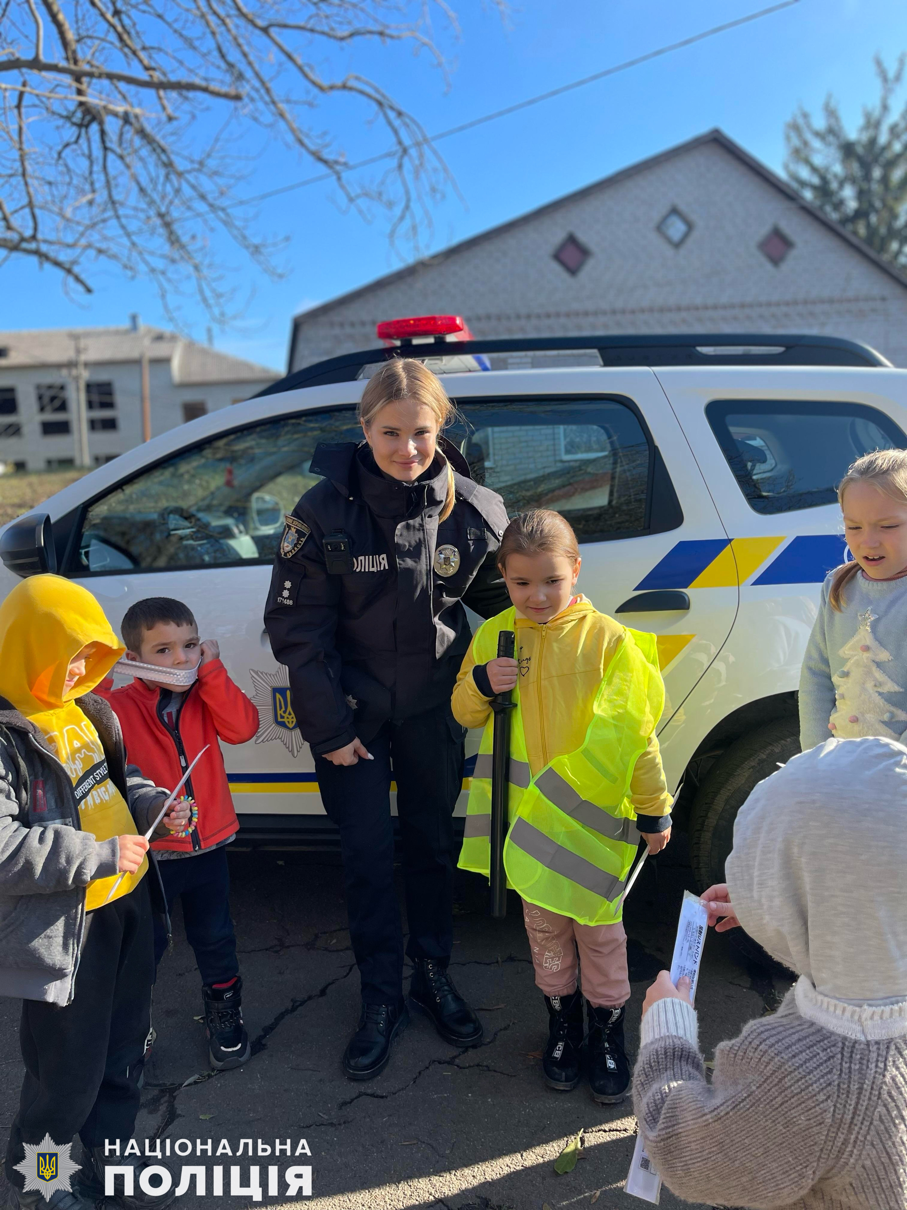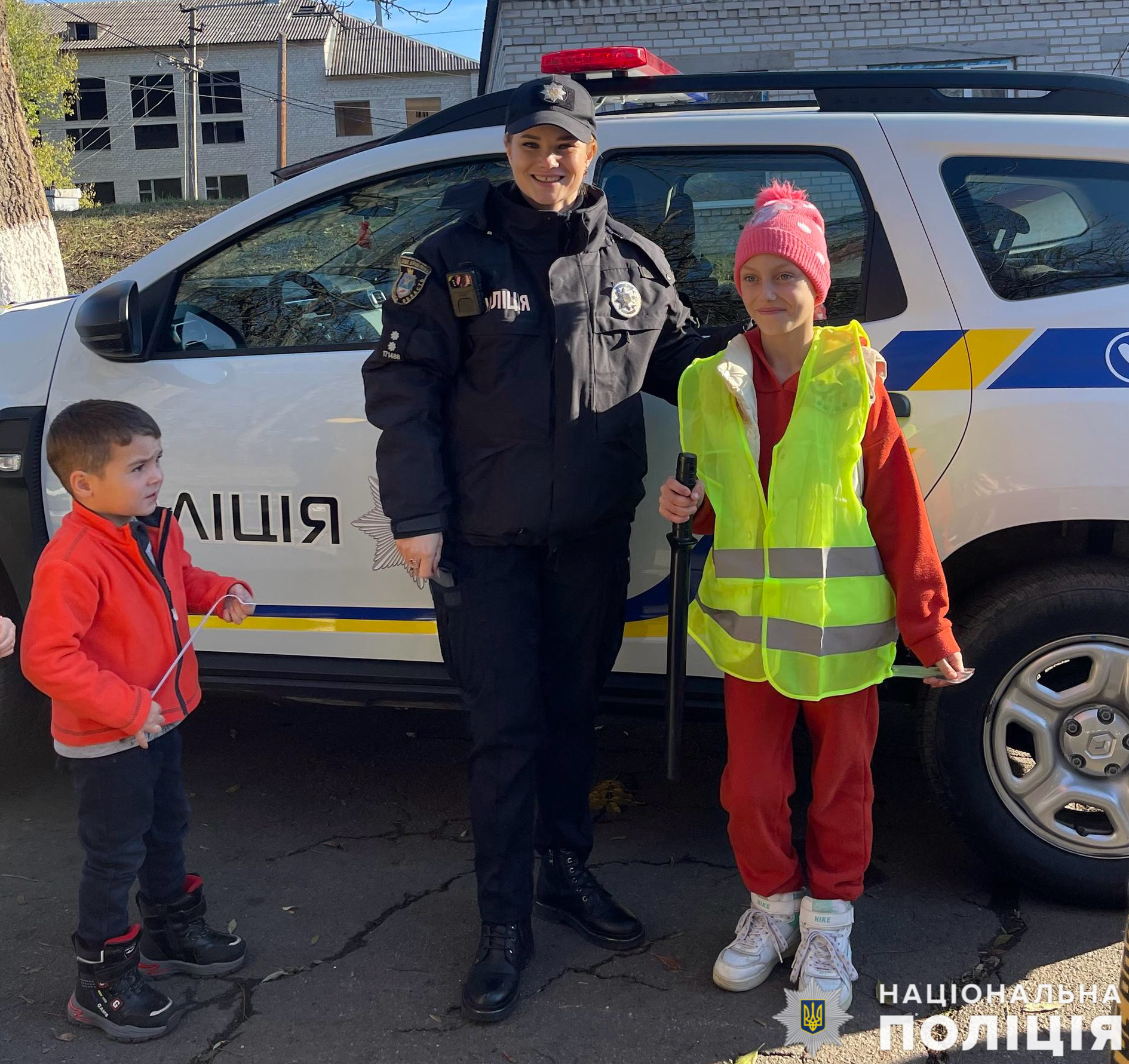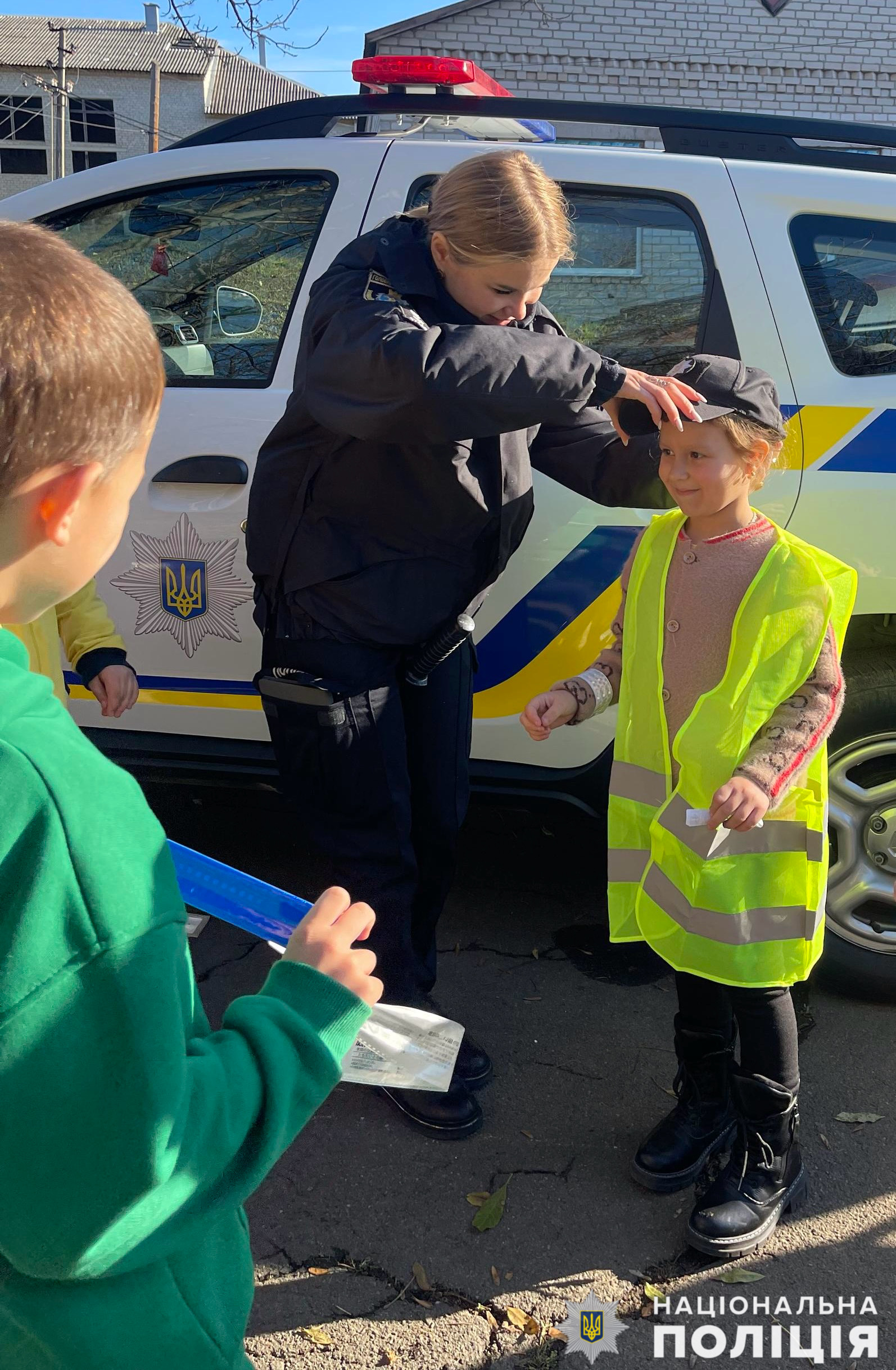 Також поліцейська нагадала про необхідність використання світловідбиваючих елементів в темну пору добу та подарувала дітворі флікери, аби вони були більш помітні для інших учасників дорожнього руху.