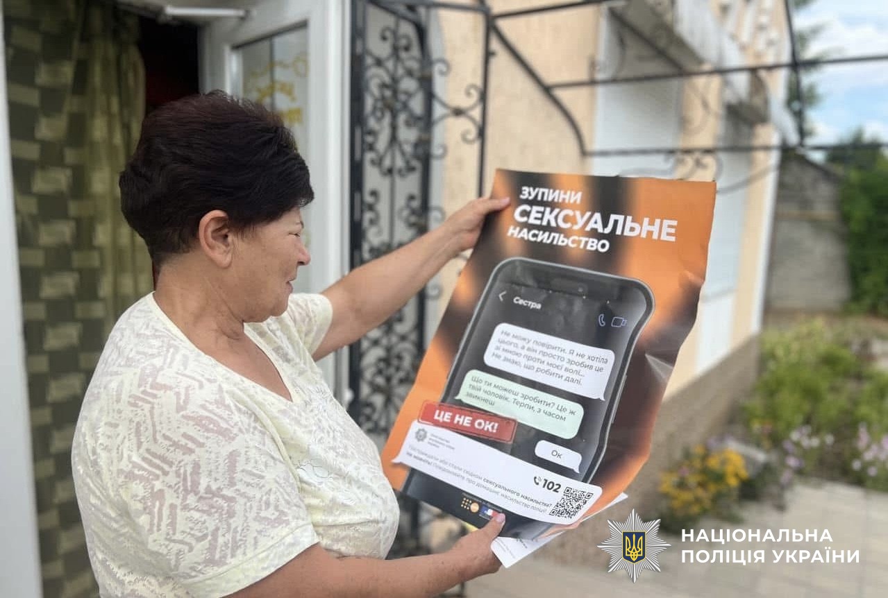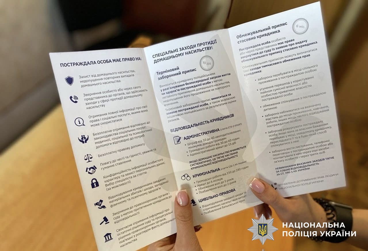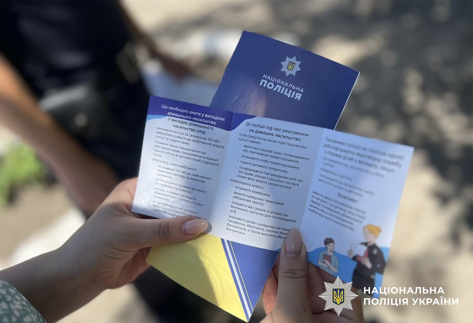 Під час спілкування поліцейський роздав громадянам спеціальні пам’ятки з інформацію про види насильства, як необхідно діяти та куди звертатися за допомогою.