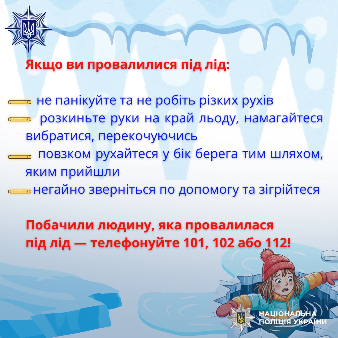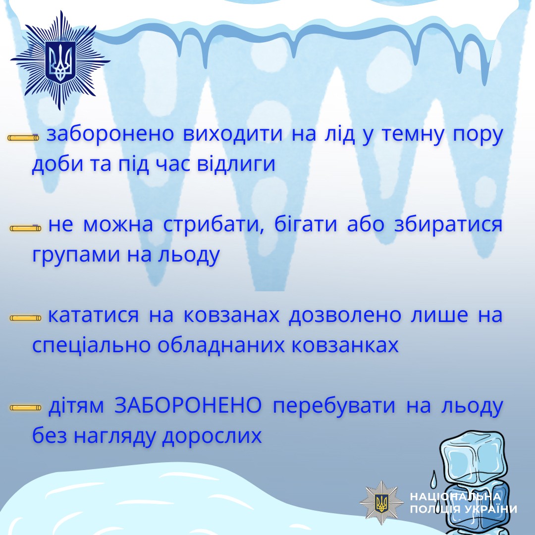 У зимовий період річки та ставки вкриті кригою стають місцем розваг і дозвілля для дітей та шанувальників зимової риболовлі. Однак, враховуючи нестійкі погодні умови та коливання температурних показників, водойми з кригою становлять неабияку небезпеку для здоров’я та життя.