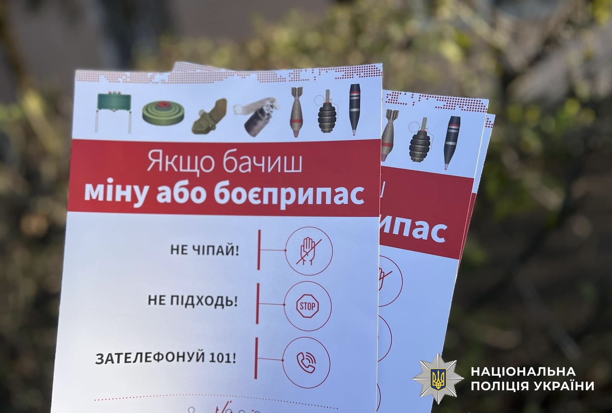 Правоохоронці вкотре звертаються до громадян із проханням ніколи не намагатись розміновувати територію самостійно! Це вкрай небезпечно як для вас особисто, так і для інших людей. Знешкодження та розмінування вибухонебезпечних предметів мають виконувати лише фахівці. Від правильних і вчасних дій залежить не лише ваше життя та здоров’я, а й оточуючих.
