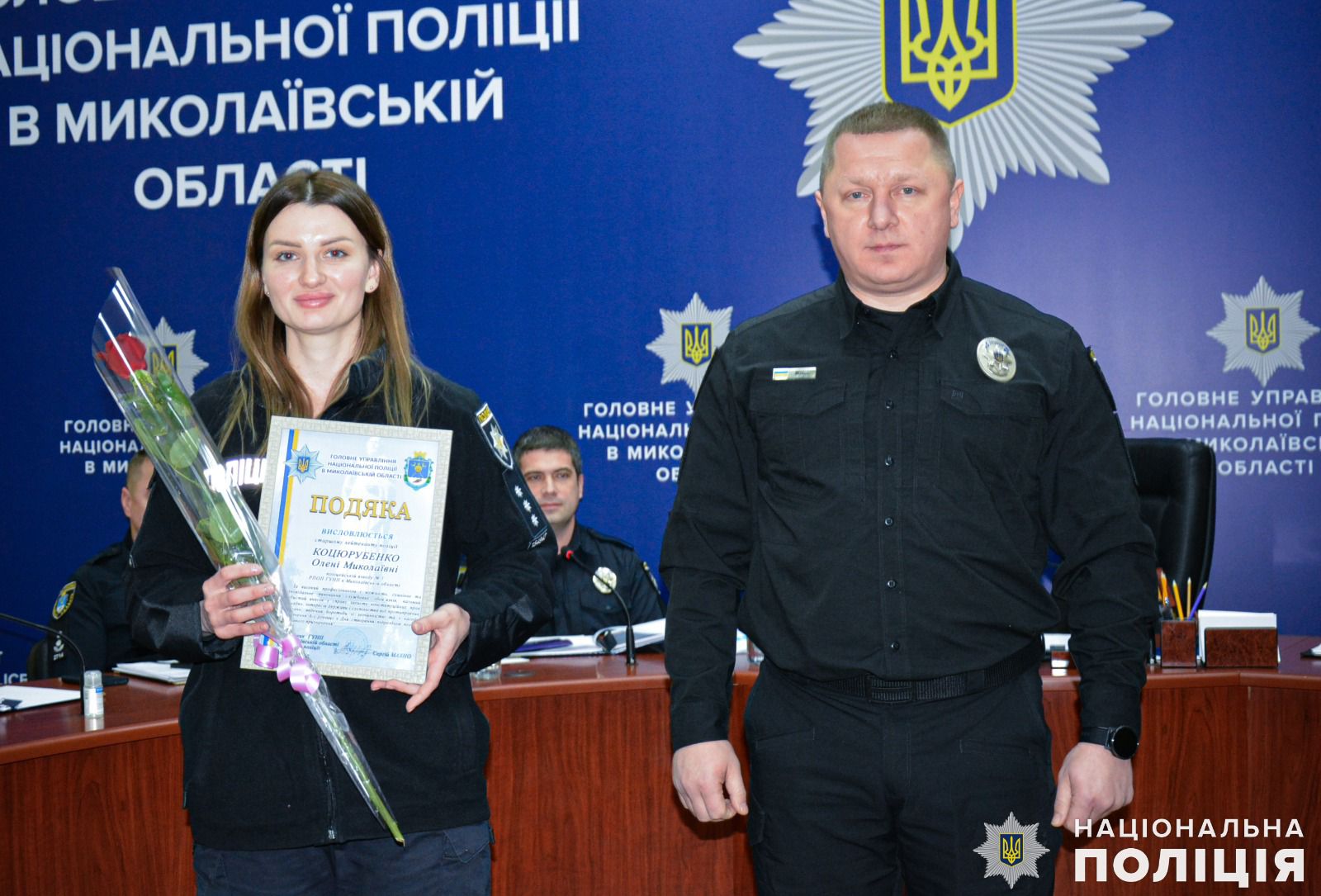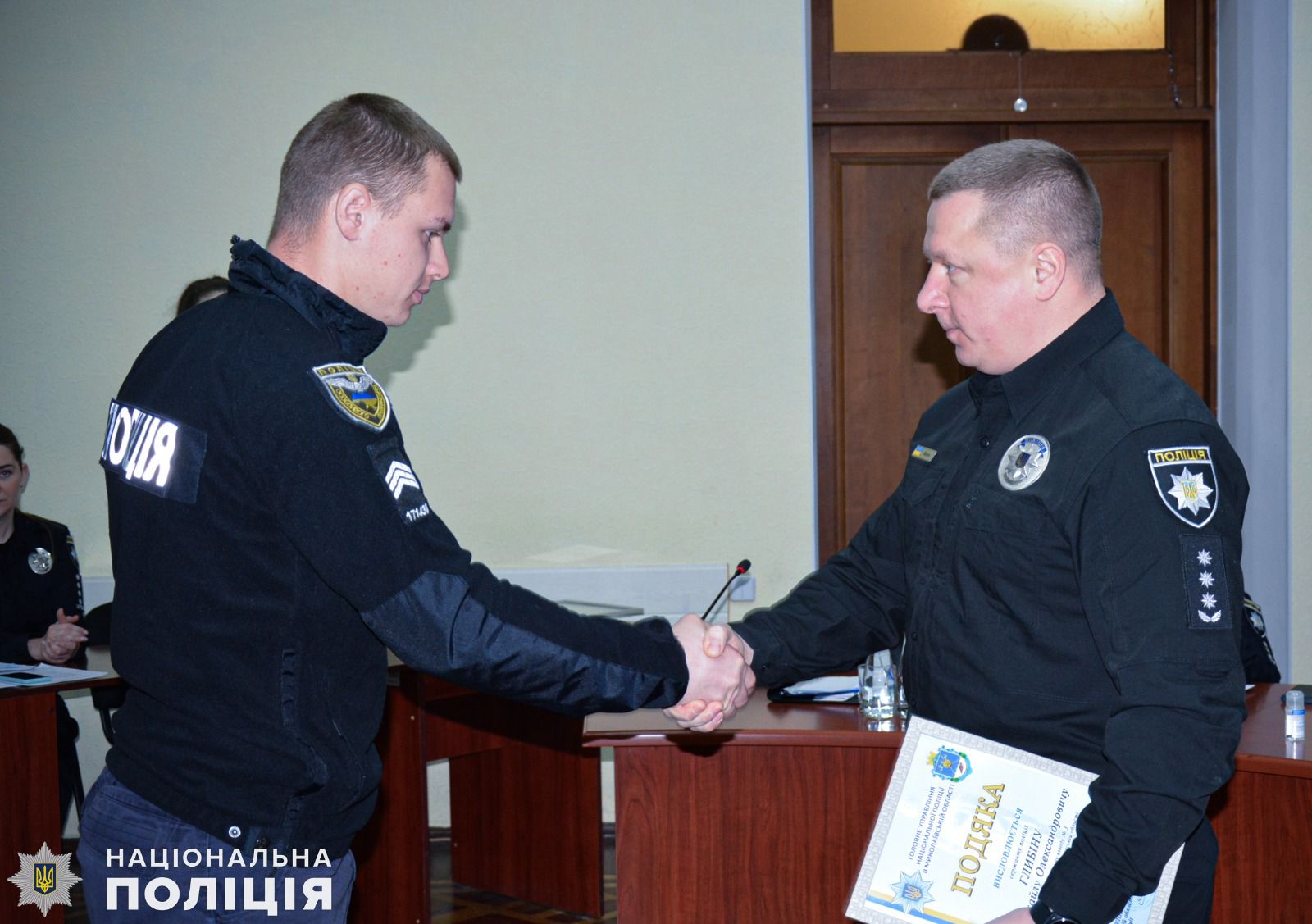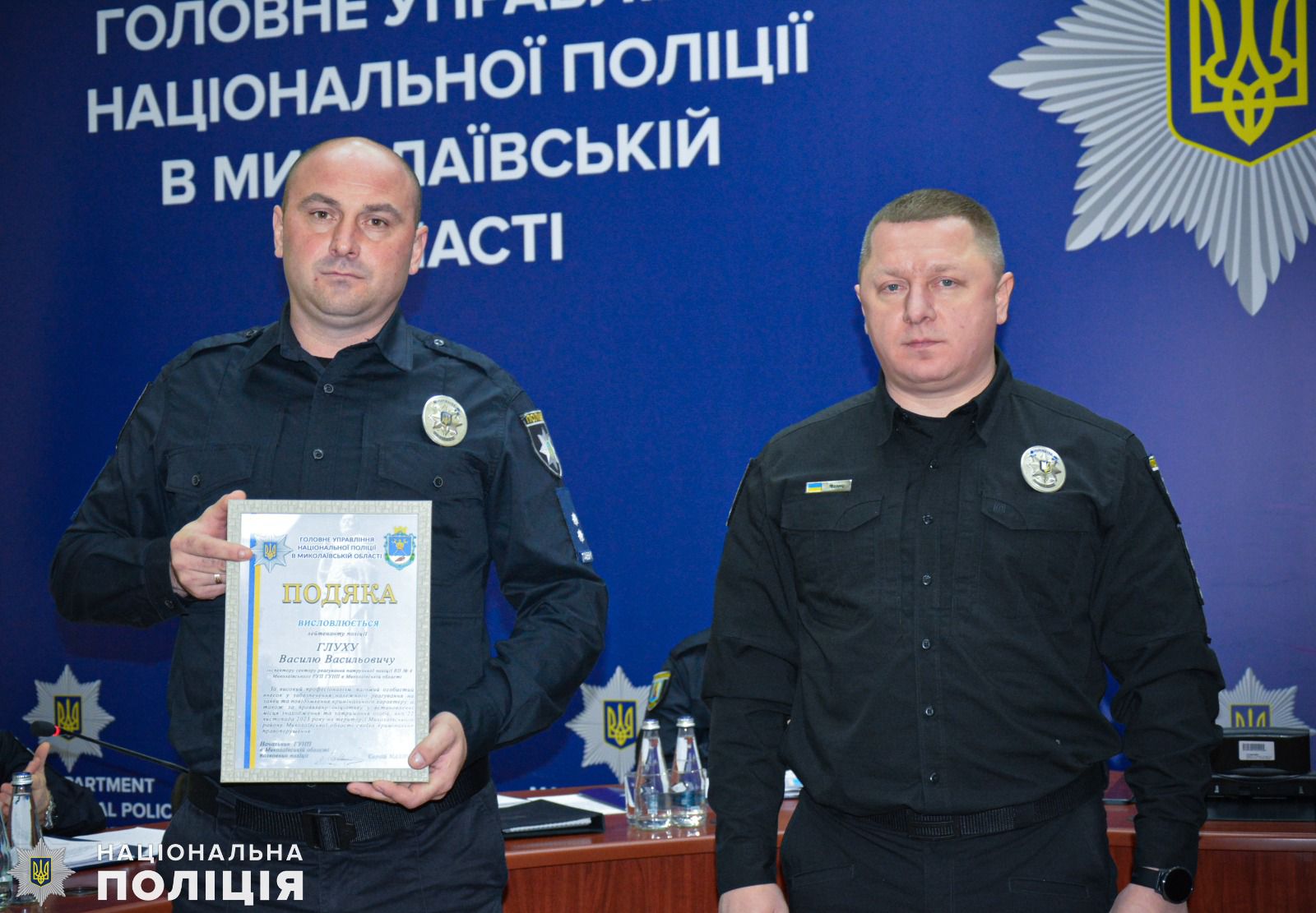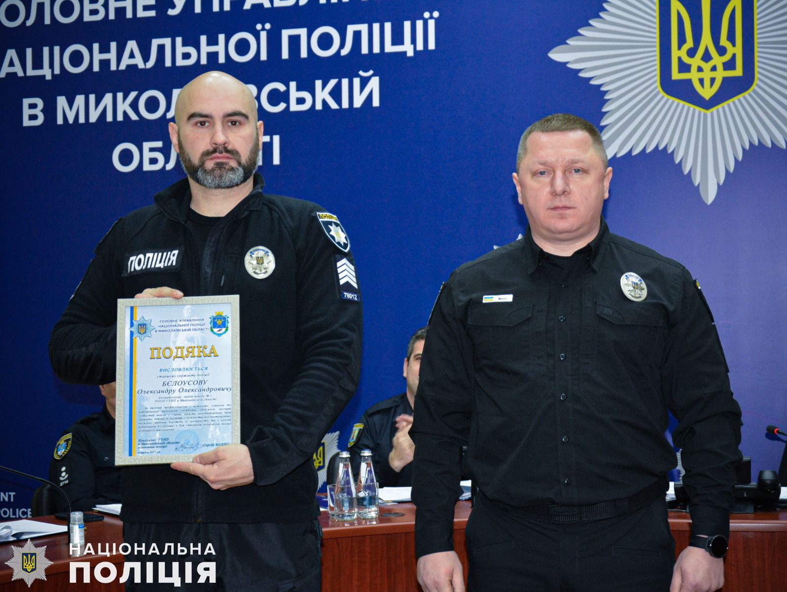 Також очільник поліції області вручив подяки дільничним офіцерам Миколаївського райуправління поліції Сергію Сопронюку та Віталію Орлову за встановленні місця знаходження та затримання особи, яка скоїла крадіжку 100 тисяч гривень мешканки Миколаєва. А за оперативне розкриття замаху на вбивство у Миколаївському районі, де місцевий житель кинув гранату у човен, в якому знаходились його знайомі, полковник поліції відзначив подяками дільничного офіцера відділення поліції № 4 Миколаївського райправління Євгена Голоту та інспектора сектору реагування превенції Василя Глуха.
