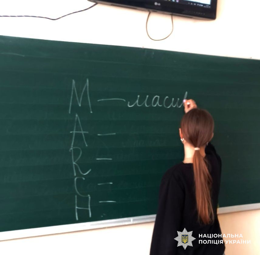Поліцейська ознайомила старшокласників із системою надання допомоги за алгоритмом MARCH, навчала визначати наявність дихання за принципом «Бачу, чую, відчуваю» та нагадала, куди слід звертатися у разі надзвичайної ситуації.
