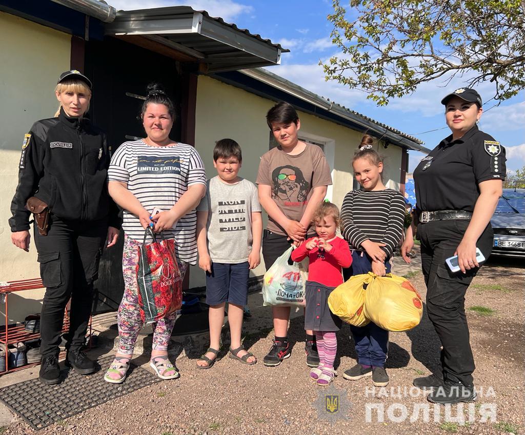 Сьогодні, 4 травня, співробітники ювенальної превенції Первомайського районного відділу поліції відвідали п’ять родин переселенців із зони бойових дій на Миколаївщині та Києва, в яких виховується 13 діточок, загалом шестеро дівчаток та семеро хлопчиків, які наразі потребують допомоги.