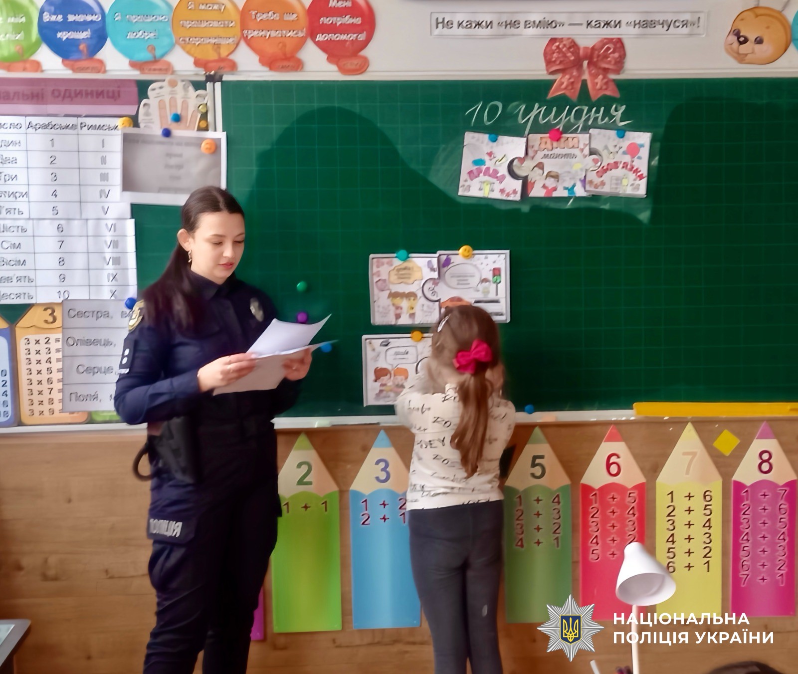 Поліцейська розповіла дітям про їх основні права, що забезпечують їм нормальний фізичний та духовний розвиток, зокрема: на життя, піклування, турботу, достатне та здорове харчування, на освіту, медичну допомогу. Наголосила на важливості дотримання обовʼязків, щоб жити у злагоді з іншими та почуватися безпечно: поважати інших, слухати дорослих, дотримуватися правил безпечної поведінки, не вчиняти протиправні дії, старанно вчитися, берегти власне здоровʼя, допомагати вдома. Окремо пояснила про різні можливі ситуації порушення прав, шляхи їх попередження, відповідальність та куди слід звертатись по допомогу в разі необхідності.