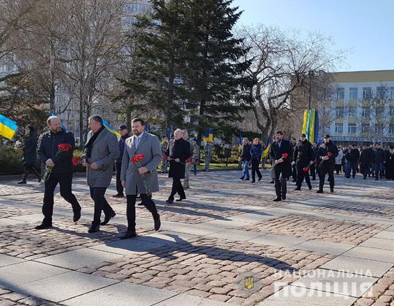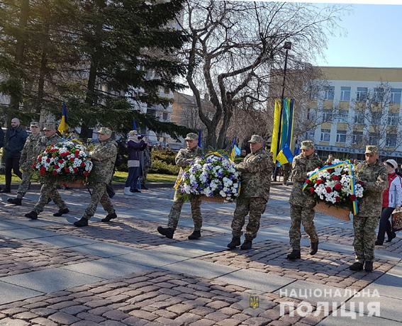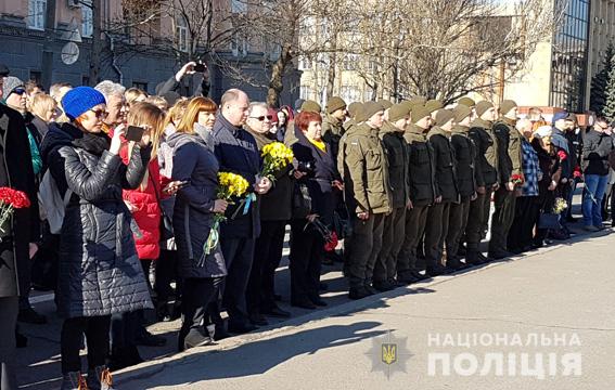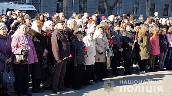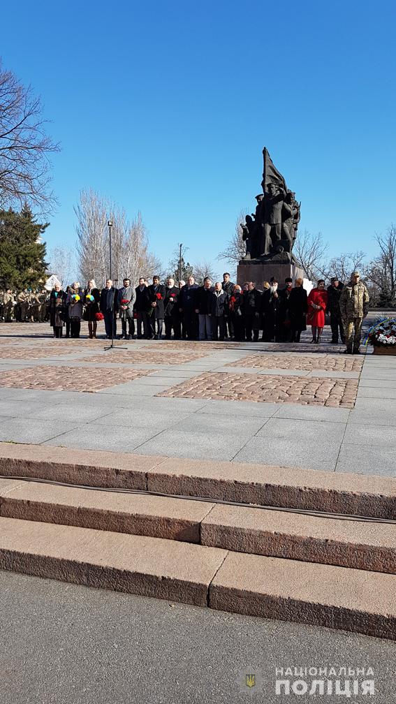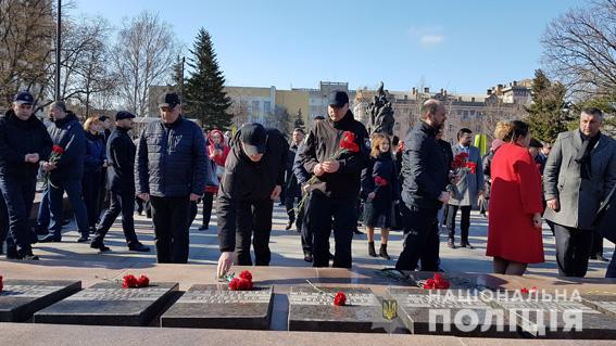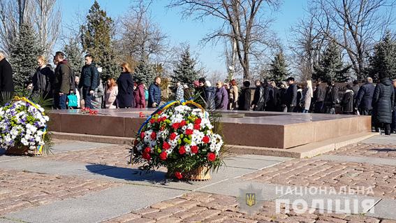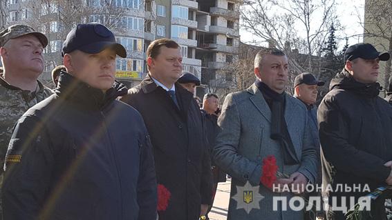 Заступник начальника обласного главку Максим Ахрамєєв та начальник патрульної поліції Віталій Даніла вшанували пам’ять героїв хвилиною мовчання та покладанням квітів до меморіального комплексу на честь героїв-десантників загону К.Ф.Ольшанського.