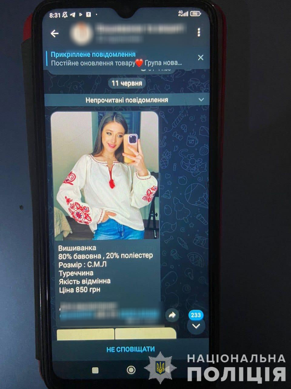 Поліцейські встановили, що у спеціально створеному каналі одного з месенджерів фігурантка розміщувала оголошення про продаж вишитих сорочок, які коштували від 850 до 1 000 гривень за одиницю. Насправді ж патріотичного одягу дівчина не мала. Фото для розміщення у своєму каналі копіювала з інтернету. Від потенційних покупців зловмисниця вимагала стовідсоткову переплату, і коли отримувала грошові кошти за замовлення на картковий рахунок, шахрайка зникала.