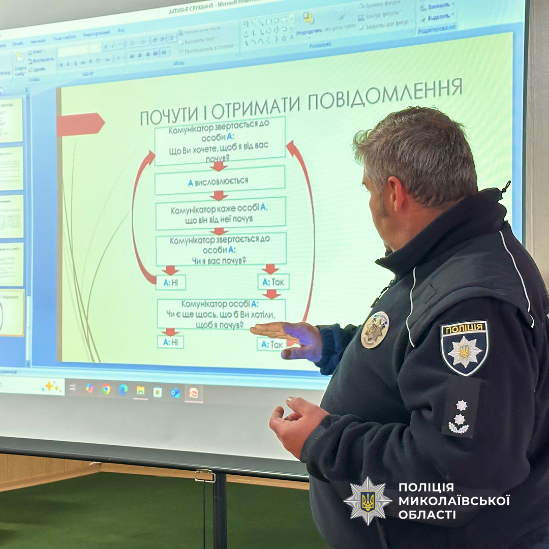 Тренінгове заняття із професійної майстерності у сфері кризового та конфліктного спілкування провів начальник сектору превентивної комунікації Миколаївського районного управління поліції Михайло Морозов разом з фахівцями управління превентивної діяльності обласного главку.