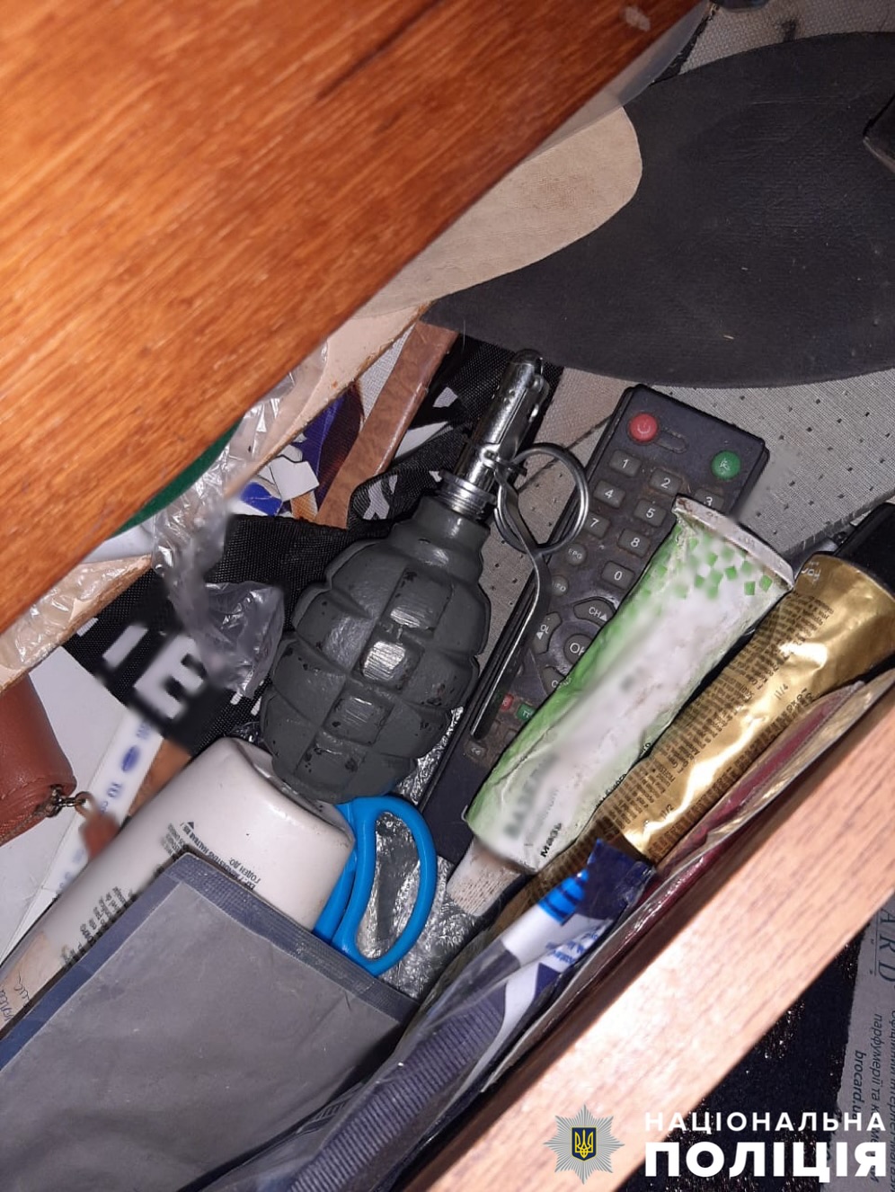 Під час проведення обшуку за місцем проживання крадіїв та в автомобілях поліцейські виявили та вилучили викрадену у заявниці золоту каблучку, частину грошових коштів та дві бойові гранати.