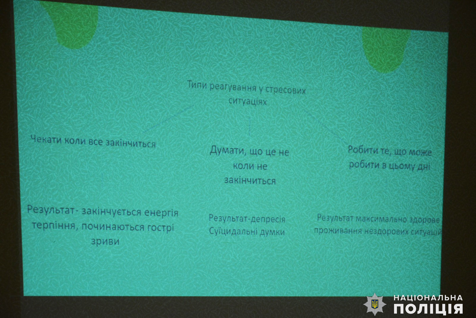Під час заняття поліцейські дізналися про поняття воєнного стресу, його етапи, ознаки гострої стресової реакції, навчилися виявляти причини стресових станів, а також оволоділи способами швидкого виходу з різноманітних типів стресових ситуацій.