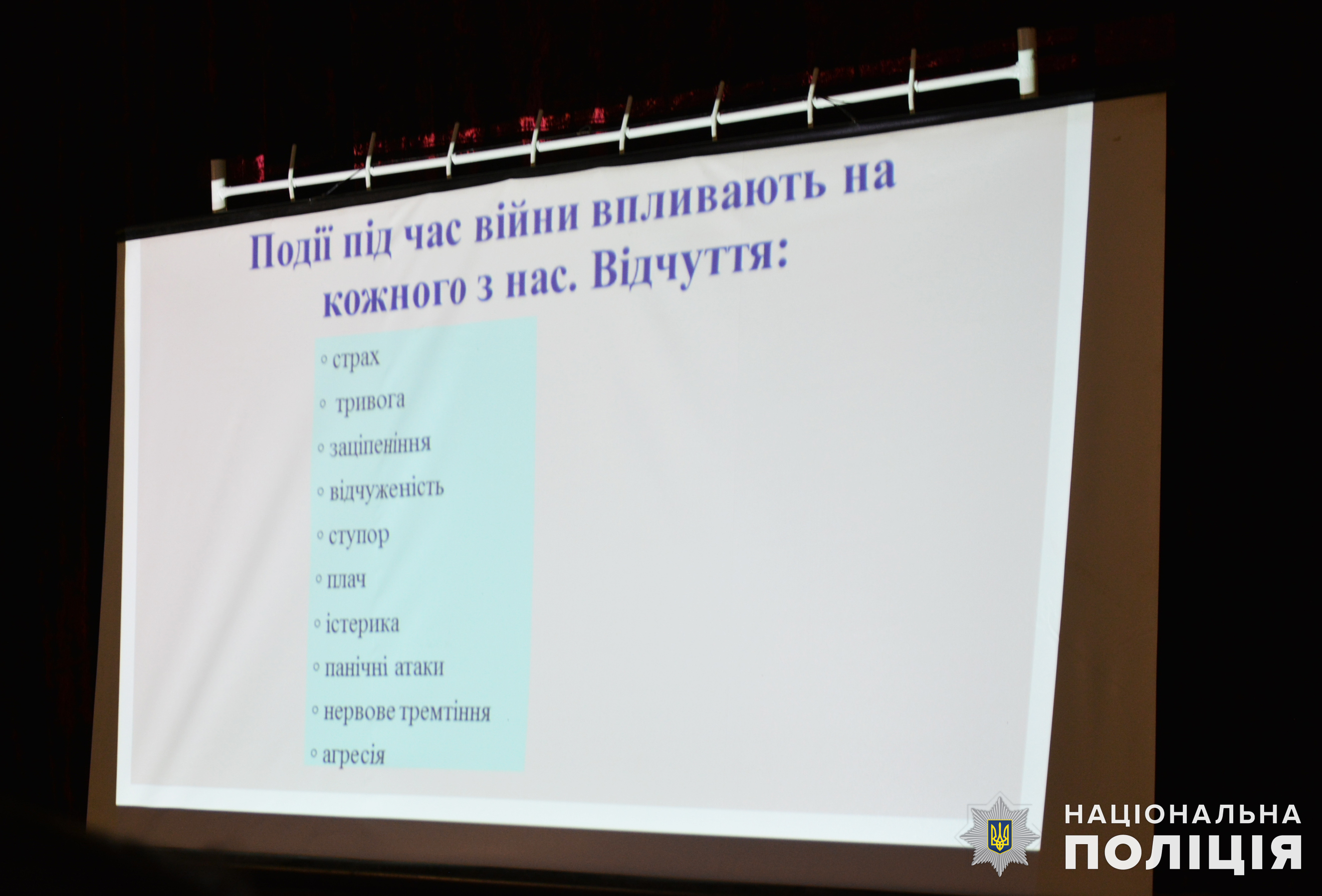 Окремо психологи торкнулися рекомендацій по роботі з населенням. Взаємодія поліцейських з громадянами – це не просто шлях до формування довіри до поліції, а постійна роз’яснювальна робота, невтомна підтримка та цілодобова допомога. Саме зараз, під час бойових дій, підтримка психічного здоров’я – один з провідних напрямків, яким опікуються фахівці. Психологи надали присутнім рекомендації по опануванню своїх емоційних проявів у стресових ситуаціях і закликали у разі потреби одразу звертатись до кваліфікованих поліцейських служби психологічної підтримки.