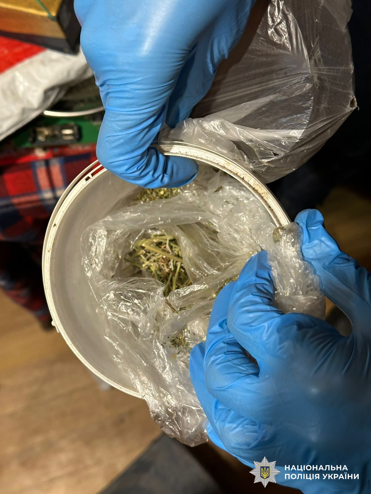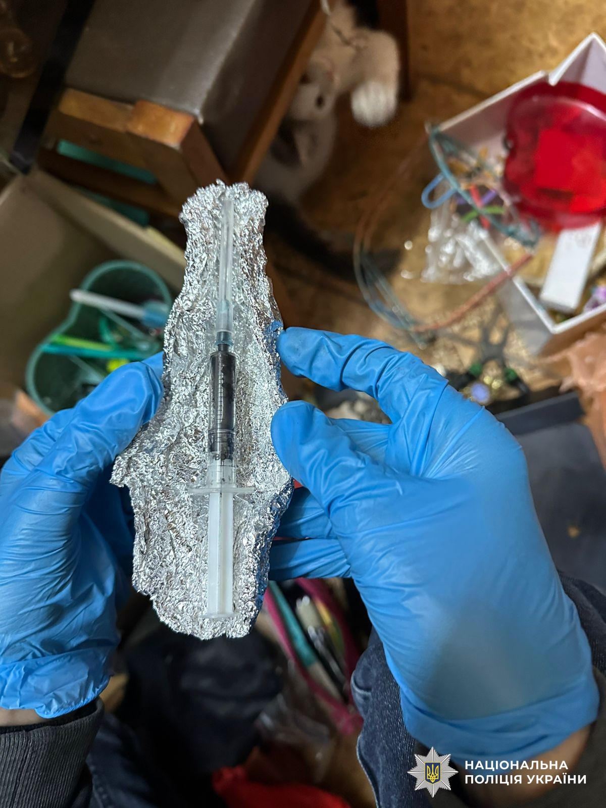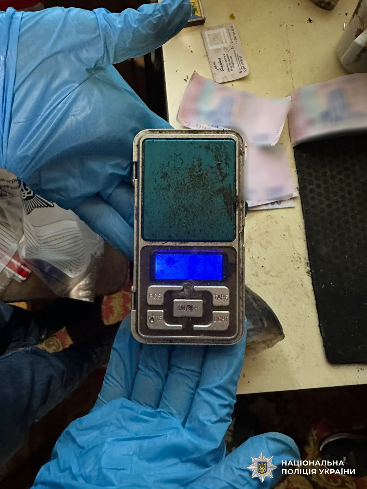 У ході санкціонованого обшуку за місцем проживання зловмисника поліцейські виявили та вилучили дзеркало з нашаруванням білої порошкоподібної речовини, зовні схожої на синтетичний наркотичний засіб, електронні ваги з залишками наркотичної речовини, речовину рослинного походження у подрібненому стані, пластиковий шприц з вмістом речовини чорного кольору невідомого походження, грошові кошти та інші речові докази злочинної діяльності.