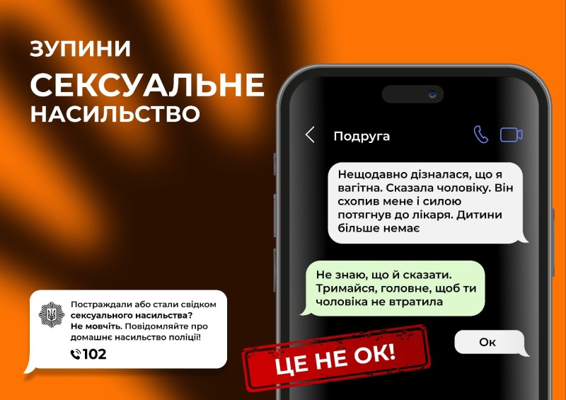 Якщо ви постраждали від насильства або стали його свідками, не мовчіть! Телефонуйте на 102 та у разі необхідності на екстрений номер служби швидкої допомоги 103!