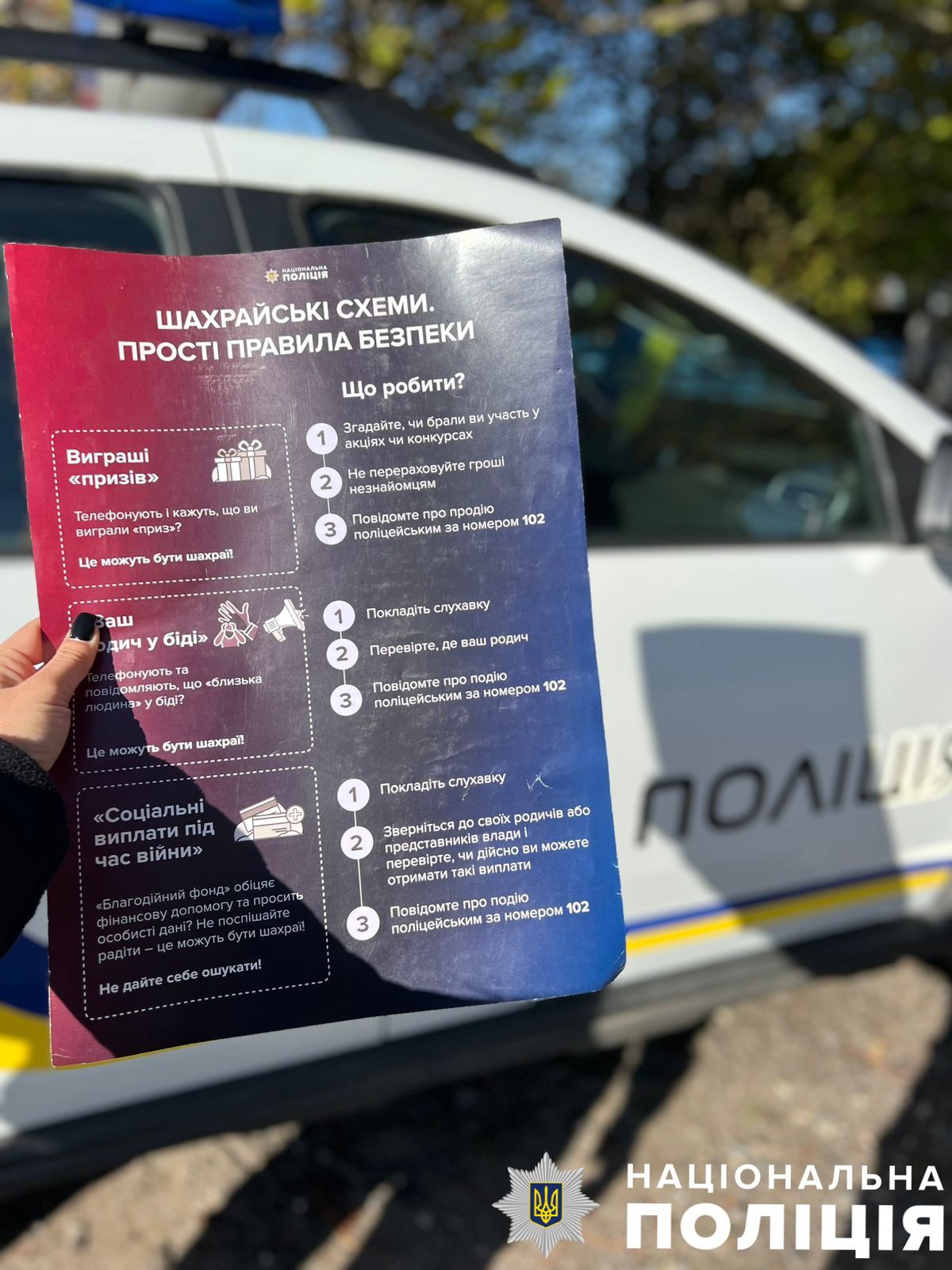 Шановні громадяни, пам’ятайте, що ваша обережність та знання правил безпеки є найкращим засобом уникнути неприємних наслідків. Якщо ж ви постраждали від шахрайських дій – якомога швидше телефонуйте за номером 102 або звертайтеся до найближчого підрозділу поліції.