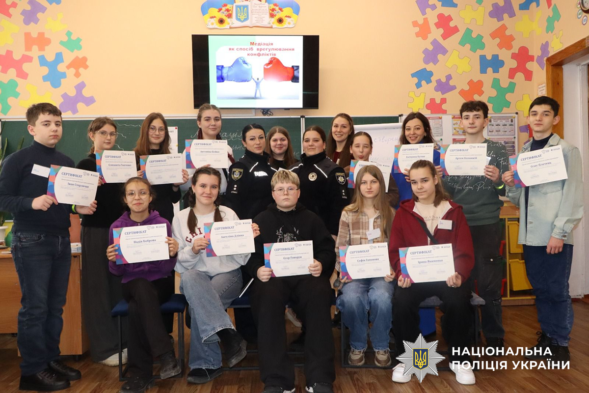До тренінгу долучились учні старших класів, яких офіцери служби освітньої безпеки ознайомили із основами медіації, як сучасного та ефективного інструменту мирного врегулювання конфліктів. Підлітки дізнались, що медіація базується на діалозі, взаємоповазі та відповідальності сторін за прийняті рішення.