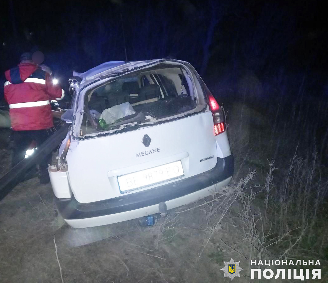 Вчора, 22 березня, приблизно о 22:50 на автодорозі Р-55 «Одеса-Вознесенськ-Новий Буг», в напрямку с. Возсіятське, водій автомобіля Renault Megan, за попередніми даними, не впорався із керуванням, виїхав за межі проїзної частини з подальшим з’їздом у кювет, де здійснив наїзд на бетонні блоки, в результаті чого автомобіль перекинуло на дах.