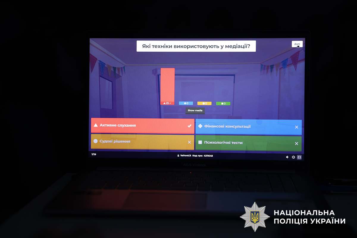 Підлітки від поліцейських тренерів дізналися про техніки медіації, принципи ненасильницького спілкування, алгоритми проведення примірювальних зустрічей, а також навчилися працювати в команді та зберігати нейтральність.