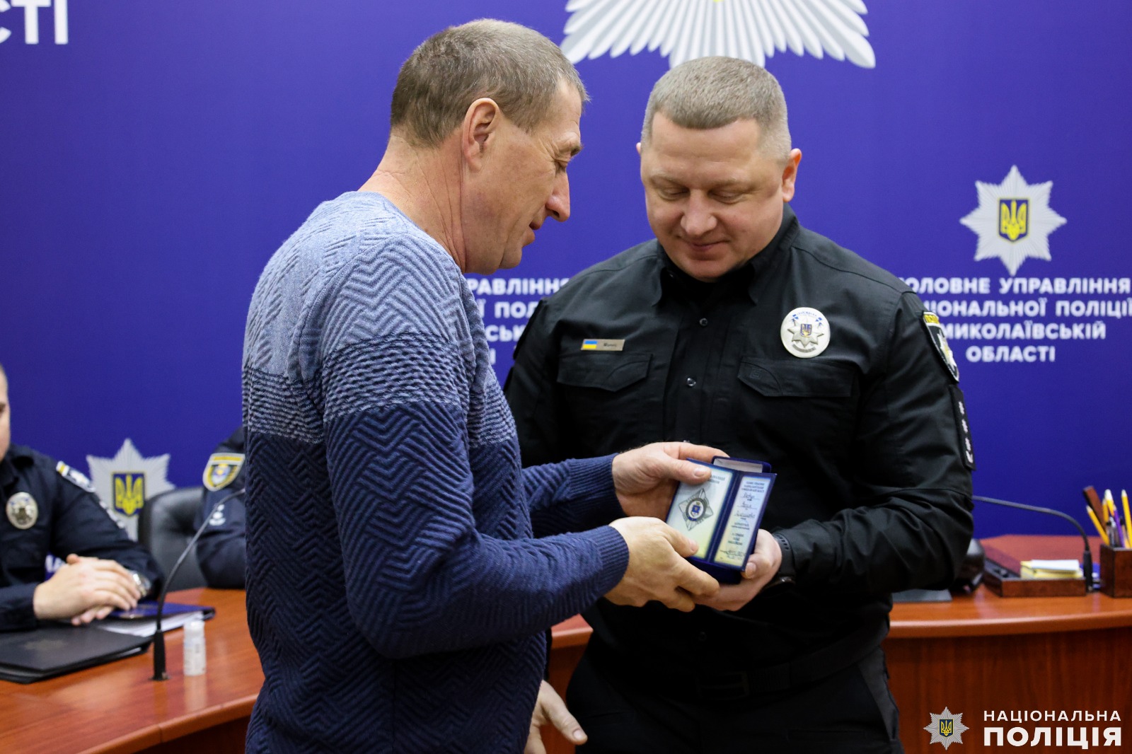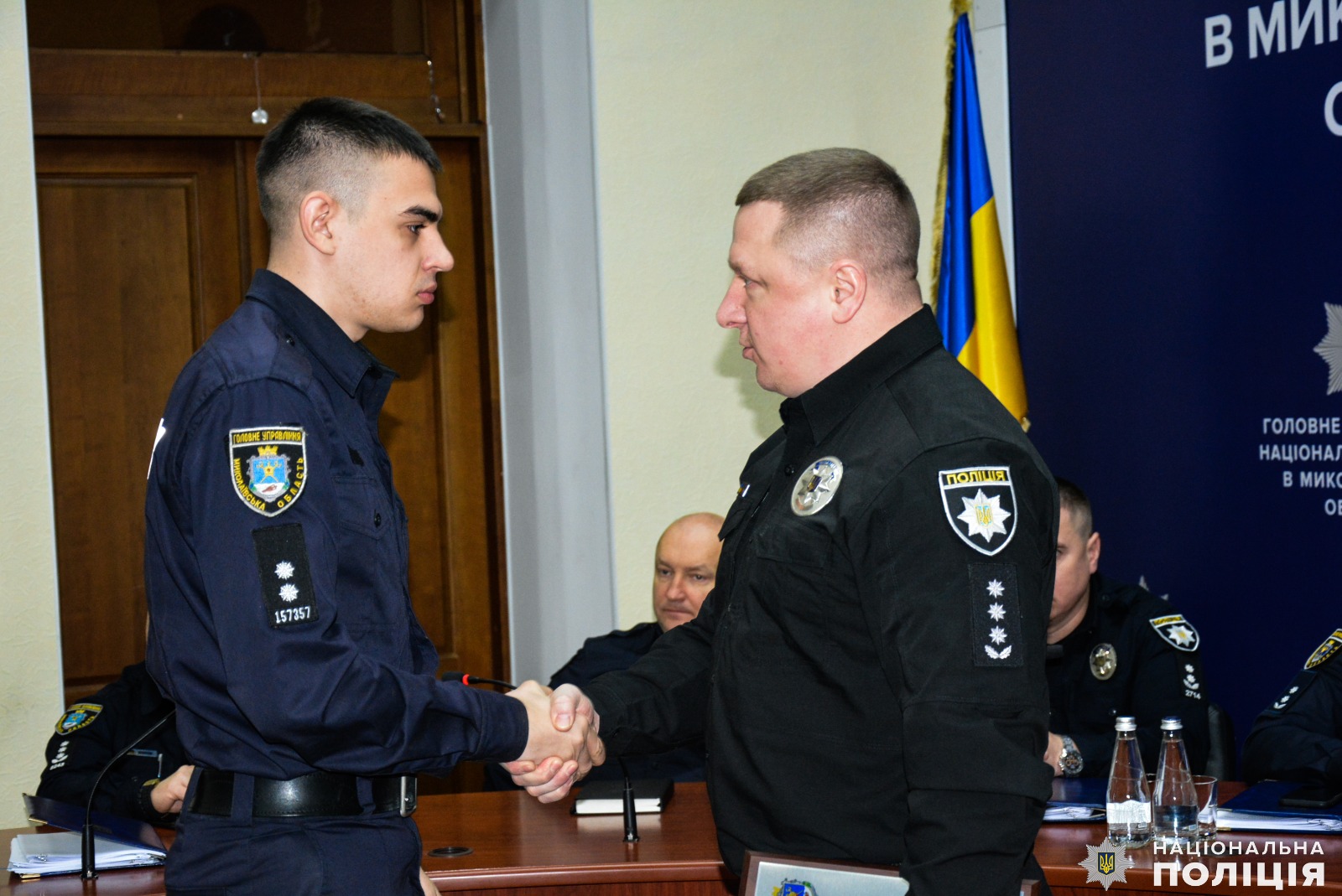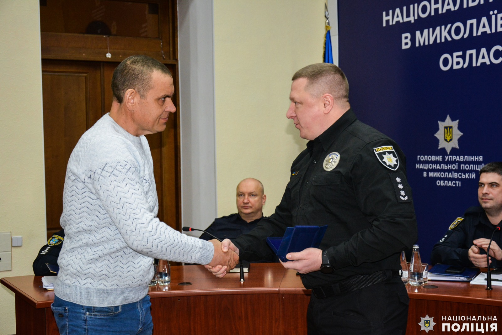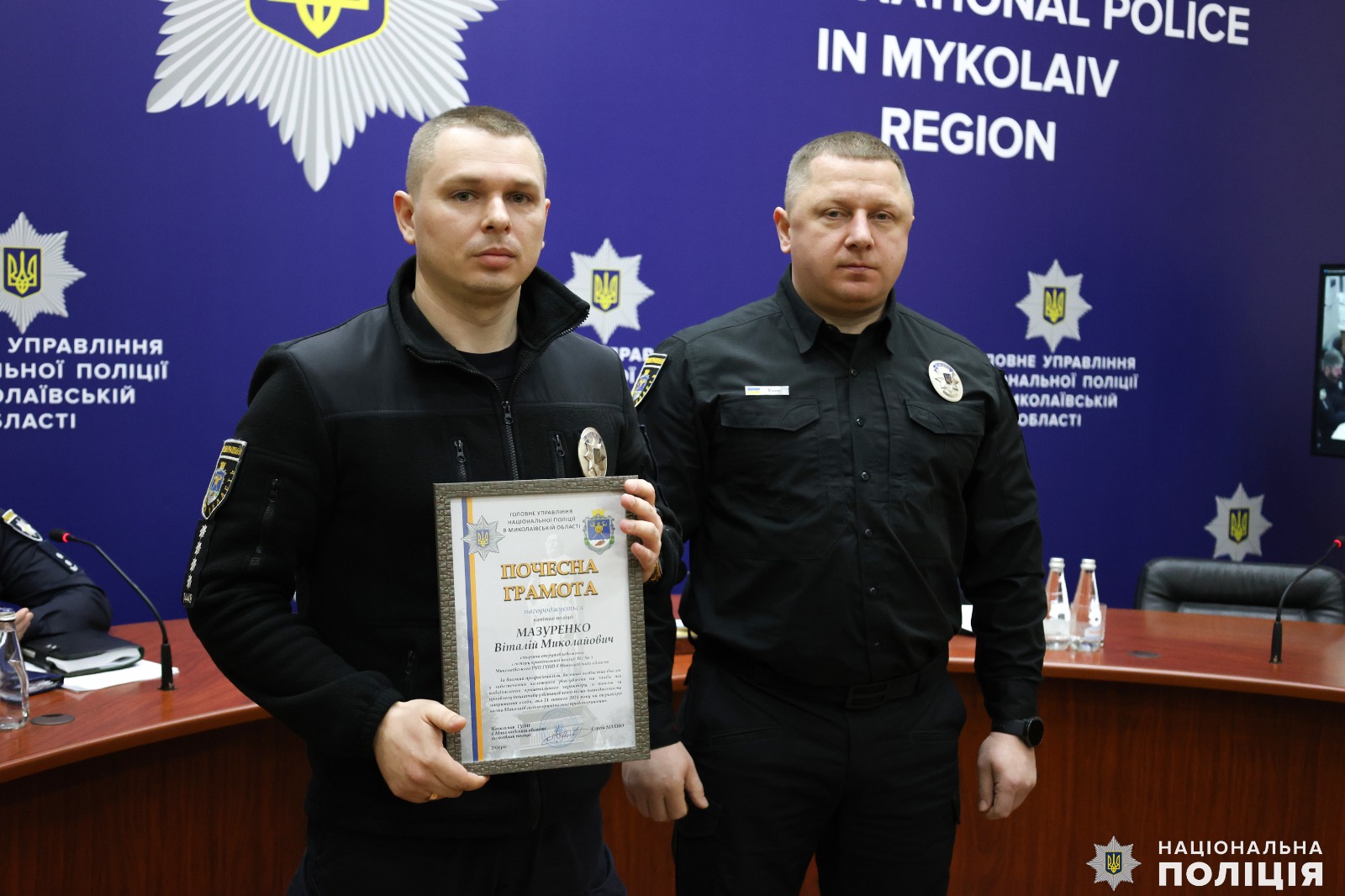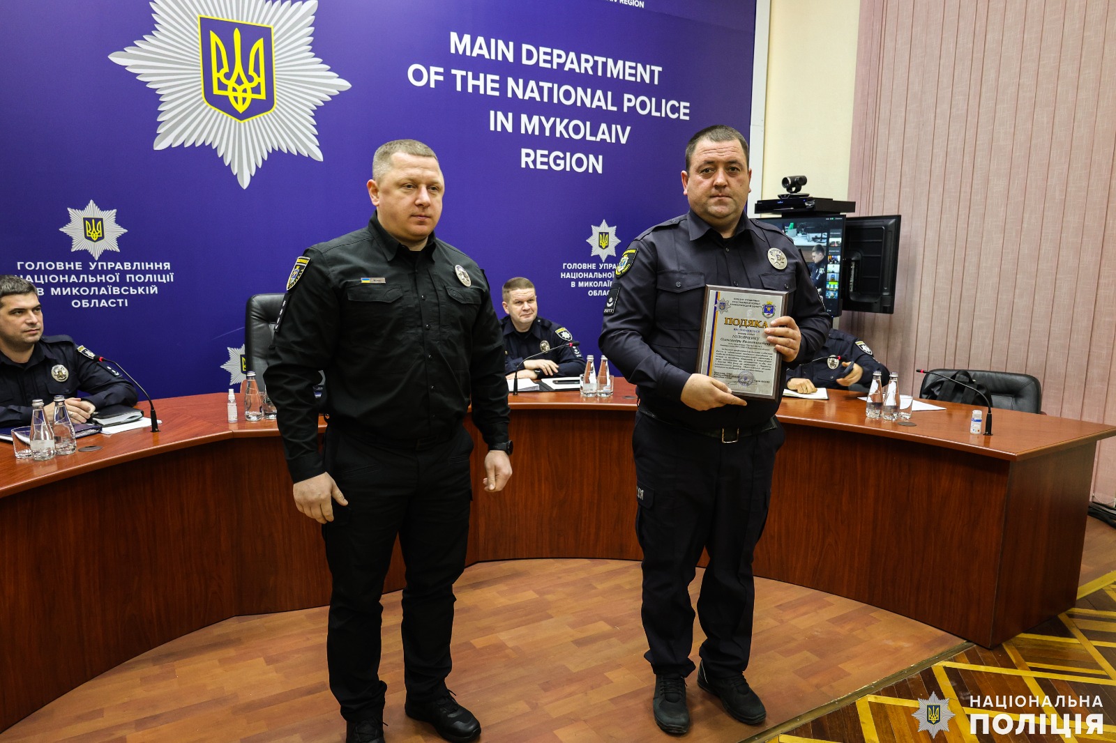 Почесними грамотами керівник поліції області відзначив і співробітників відділення поліції № 3 Миколаївського райуправління за належне реагування та затримання місцевого мешканця, який кинув вибуховий пристрій у своїх знайомих та зник з місця події.