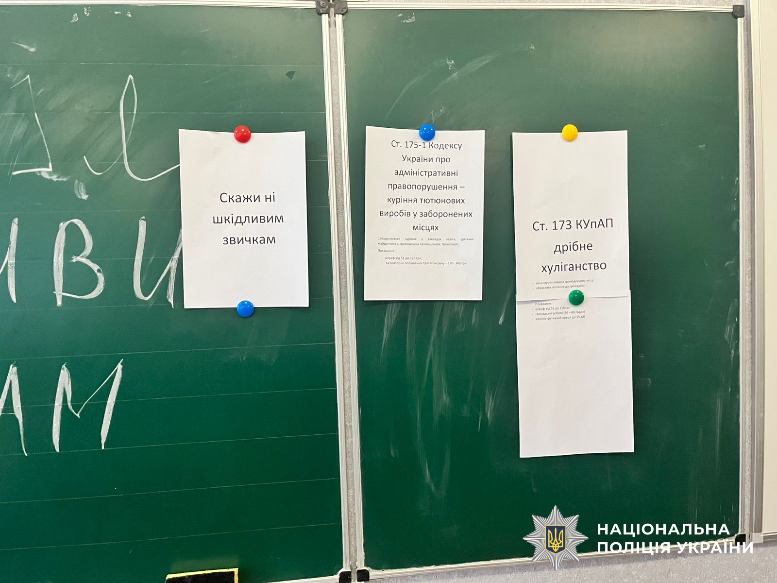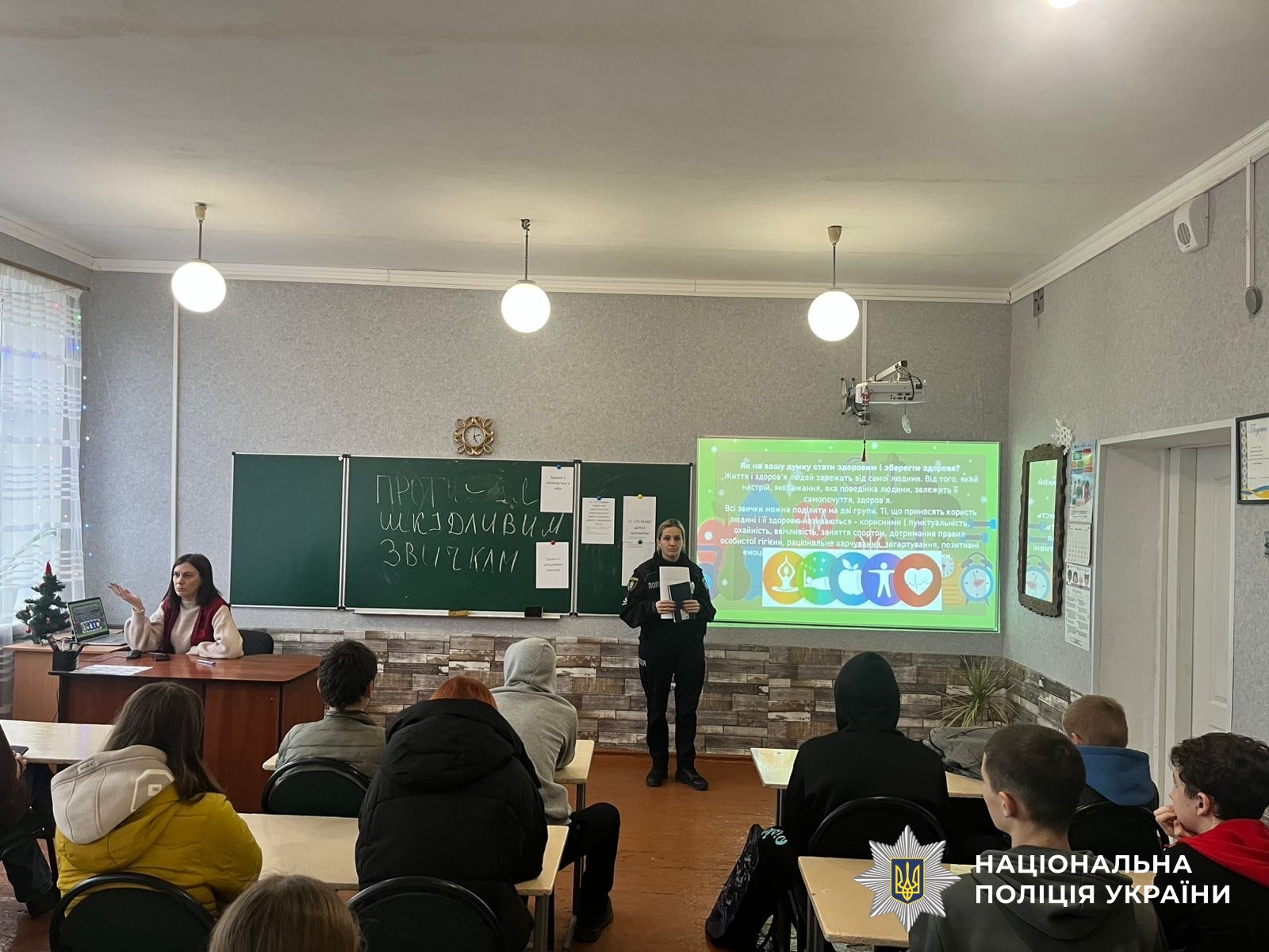 Під час заходу поліцейська поінформувала молодь про негативний вплив шкідливих звичок на фізичне й психічне здоров’я, звернувши увагу на довгострокові наслідки, які можуть позначитися на якості життя. Окремо інспектор зауважила на нормах законодавства та відповідальність, передбачену за вживання, зберігання й розповсюдження заборонених речовин.