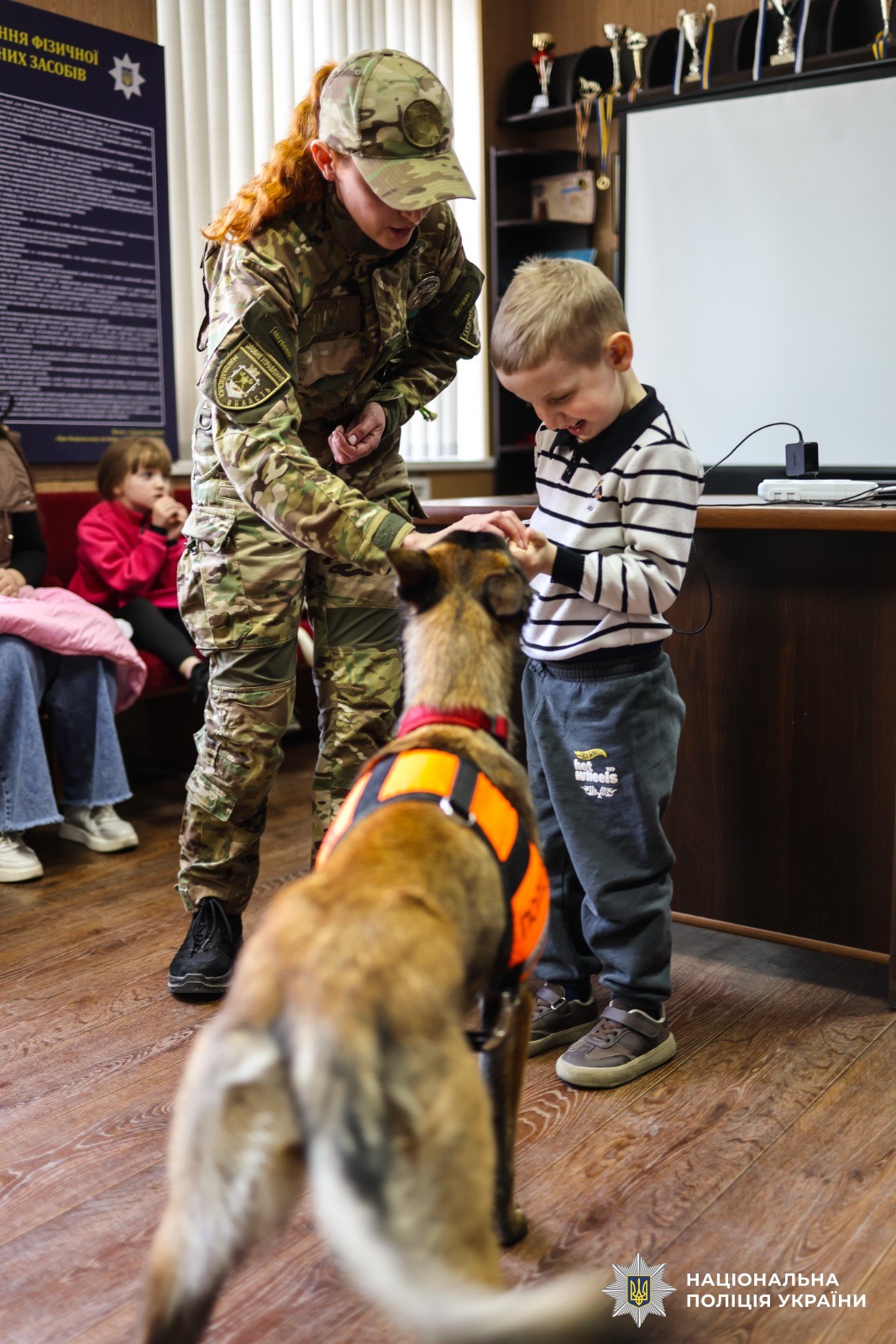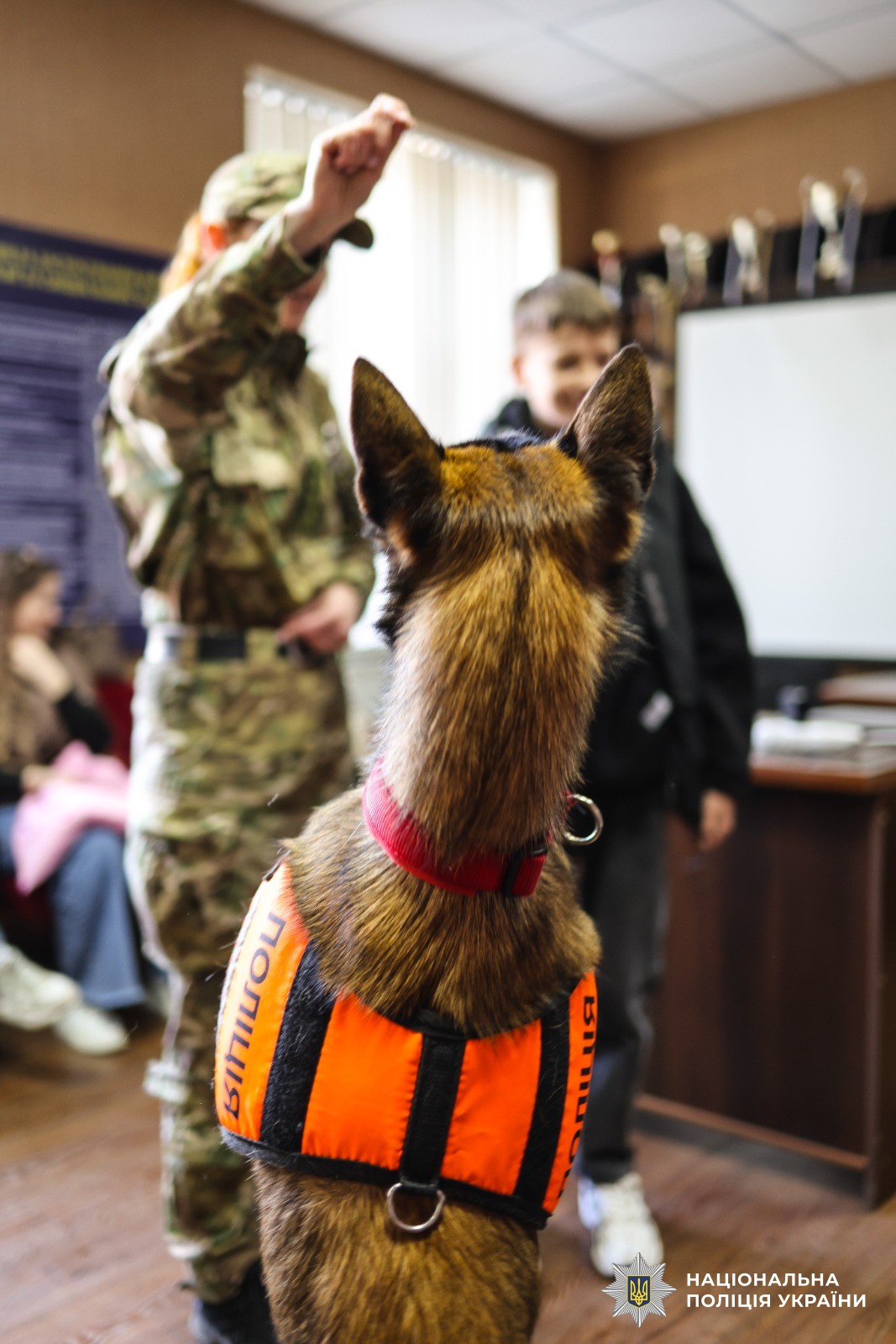 Кінологи поліції показали, як їхні підопічні виконують команди та продемонстрували елементи дресирування. Після цього дітлахи мали змогу відчути себе справжніми дресирувальниками — вони спілкувались із малінуа Ія, сертифікованою службовою собакою із психоемоційної підтримки, та давали їй команди.