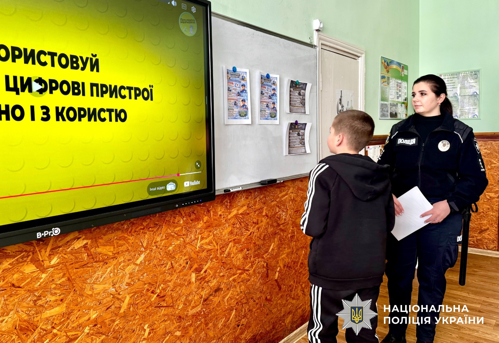 Поліцейська продемонструвала дітям навчальне відео із видами загроз, які можуть чекати на них у мережі Інтернет, зокрема: кібербулінг, онлайн-шахрайство, поширення неналежного контенту, а також ризики спілкування з незнайомими людьми.