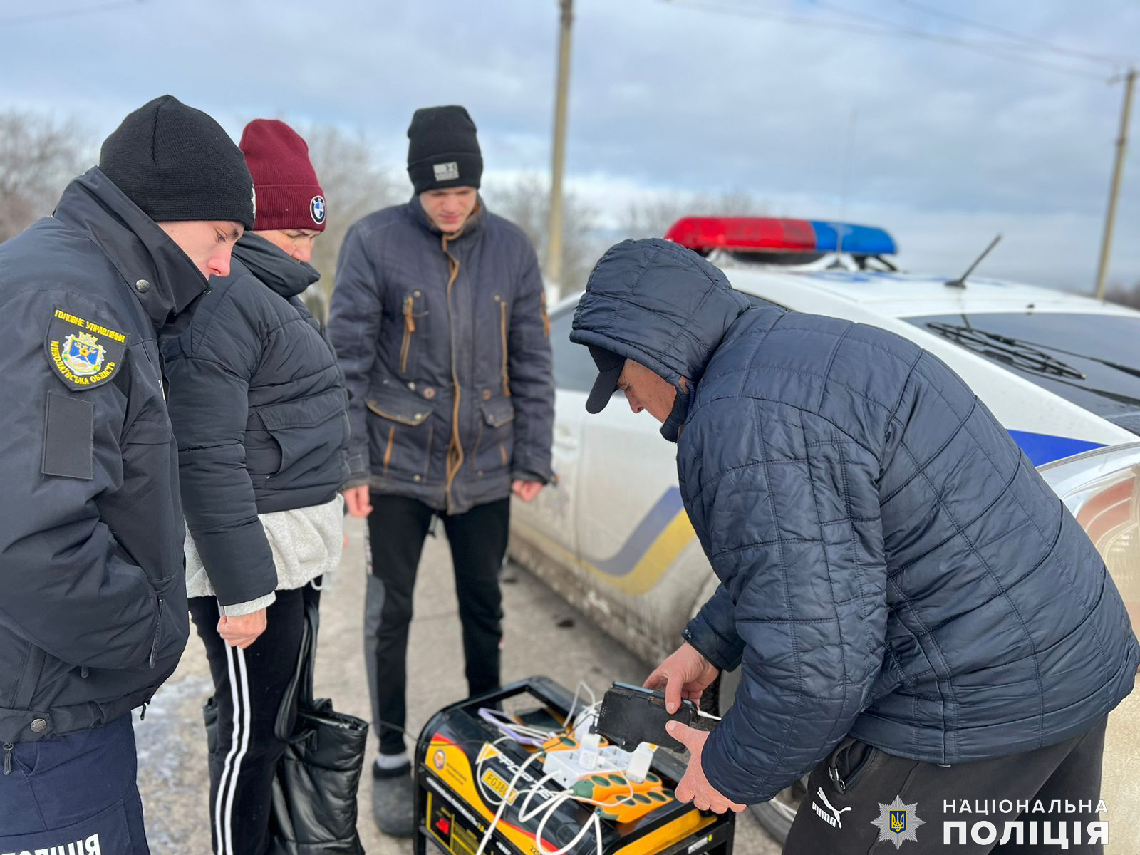 Співробітники відділення № 1 Баштанського райвідділу поліції облаштували мобільні пункти з генераторами для громадян сіл Софіївської громади, аби вони могли зарядити свої мобільні телефони, ліхтарі та інші портативні пристрої. Поліцейські курсують між селами району, які досі залишаються знеструмленими.