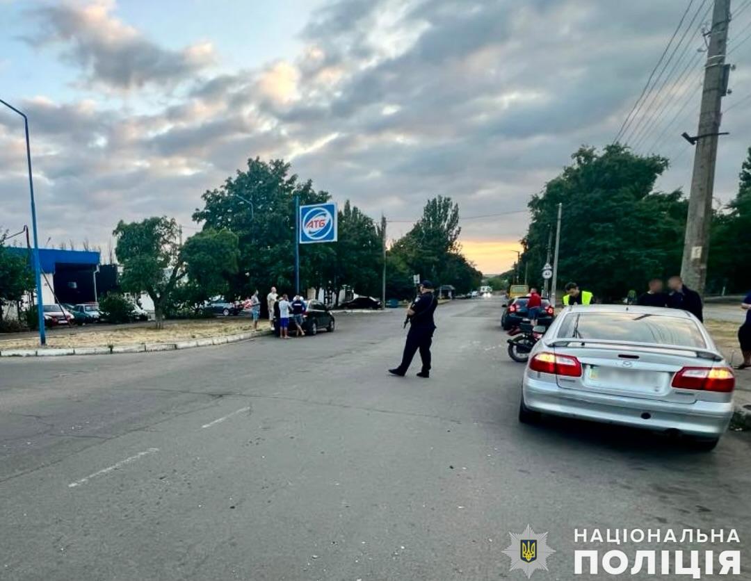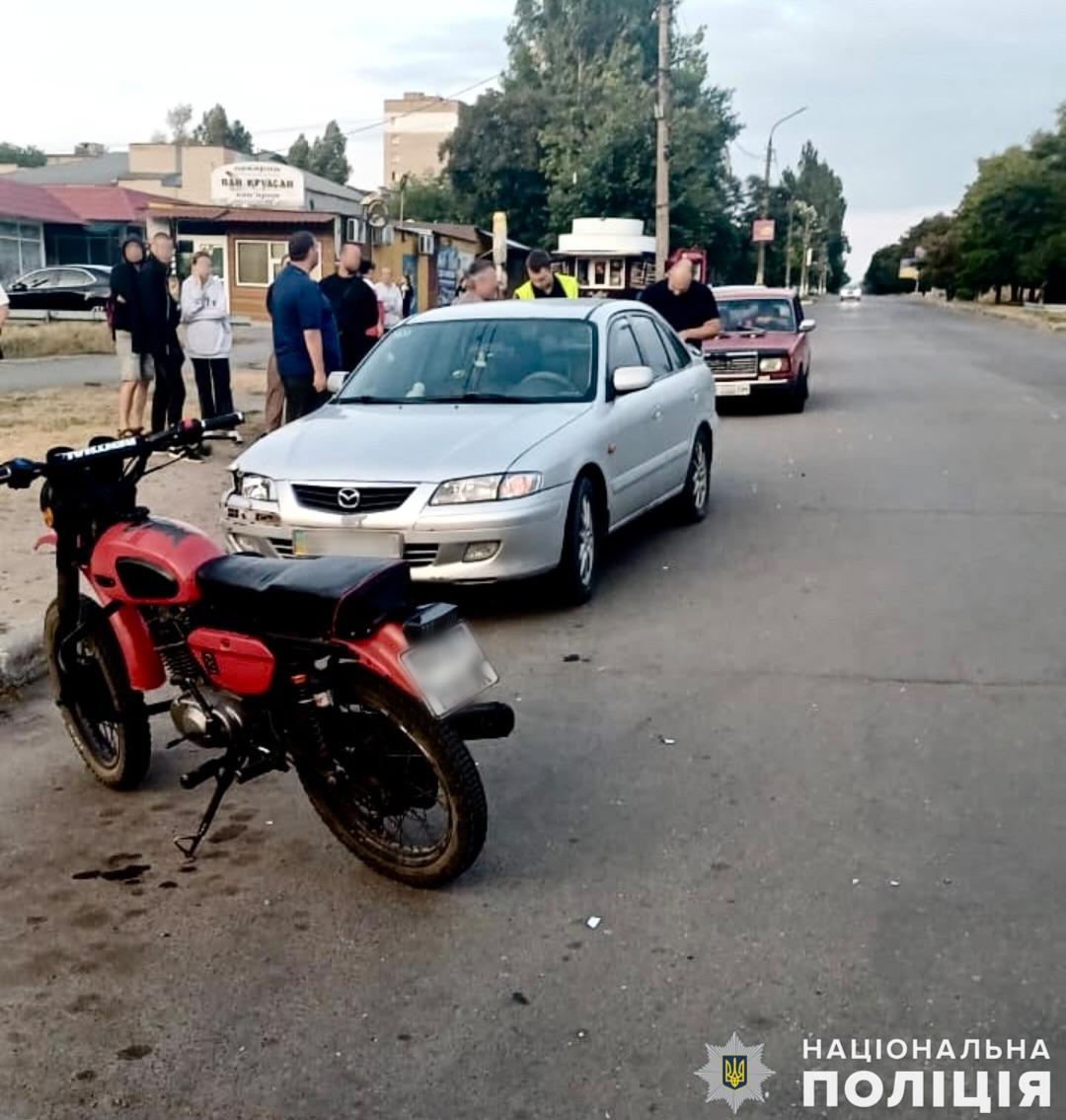 Вчора, 30 липня, близько 18:00 біля магазину АТБ, розташованого по вулиці Корабельна у місті Первомайськ, сталось зіткнення між автомобілем Mazda-626 та мотоциклом Мінськ, за кермом яких перебували 29 та 17 років чоловіки відповідно.