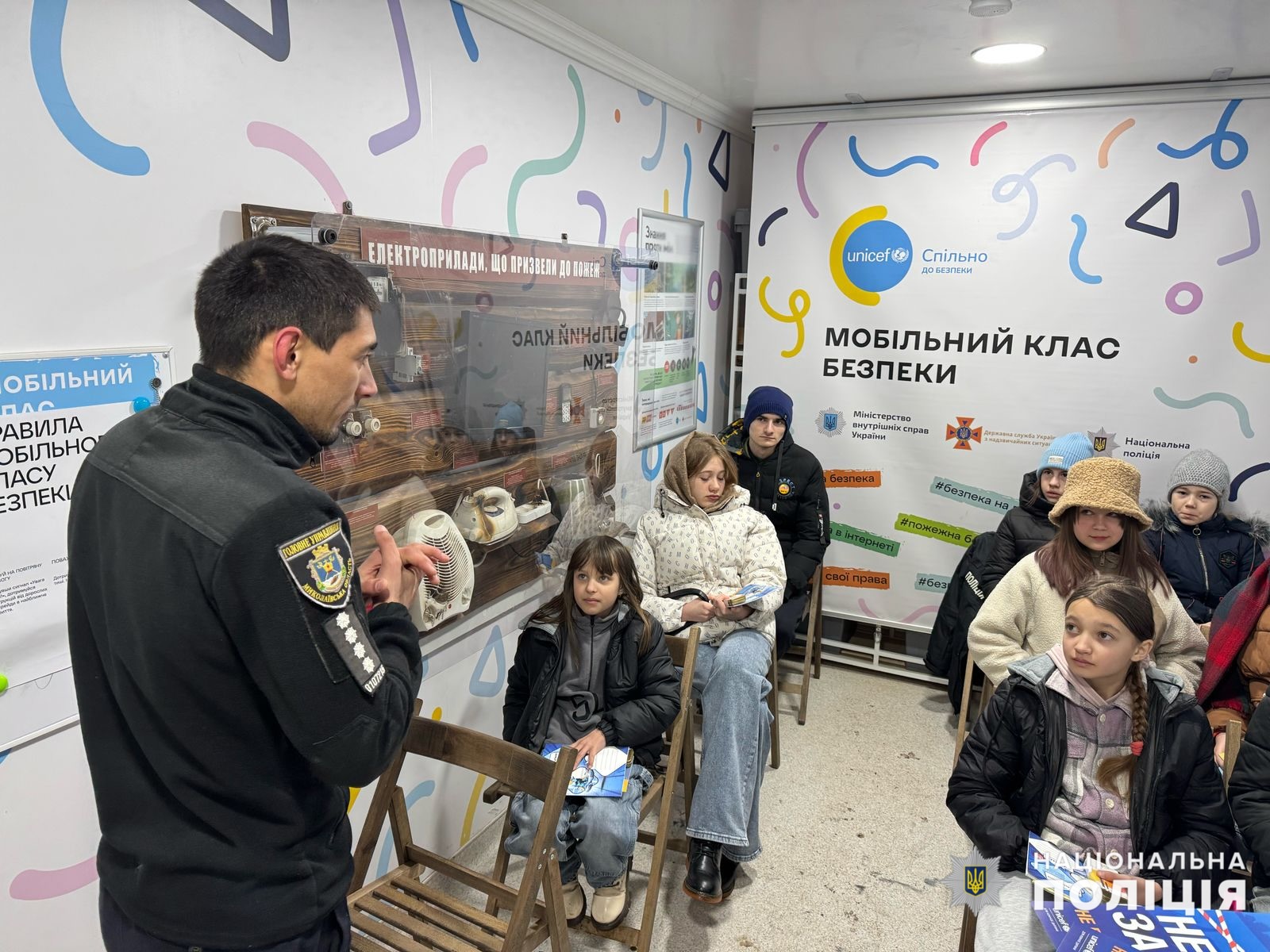 У Снігурівці поліцейські та рятувальники у мобільному класі навчали дітей життєво важливим правилам безпеки
