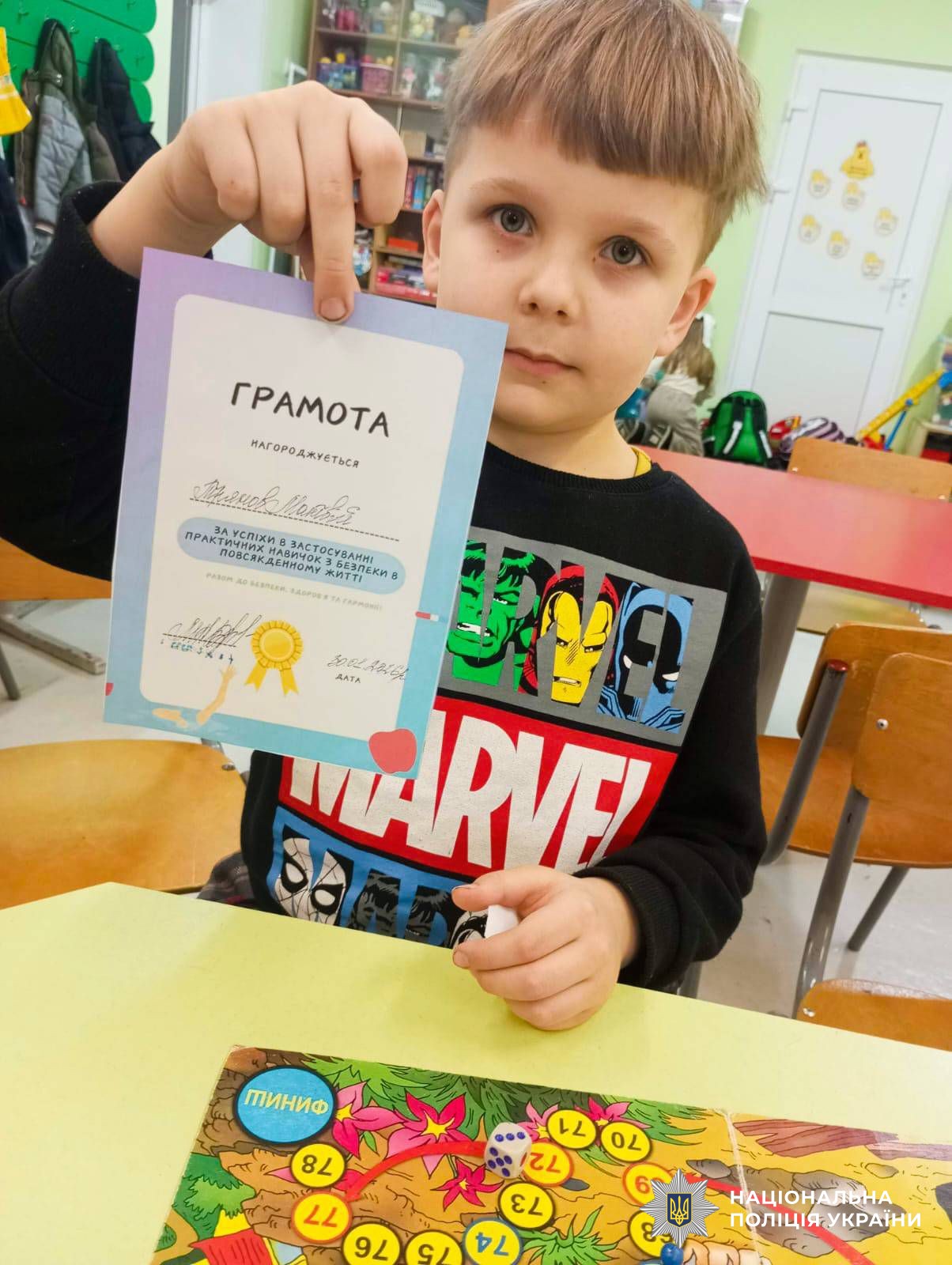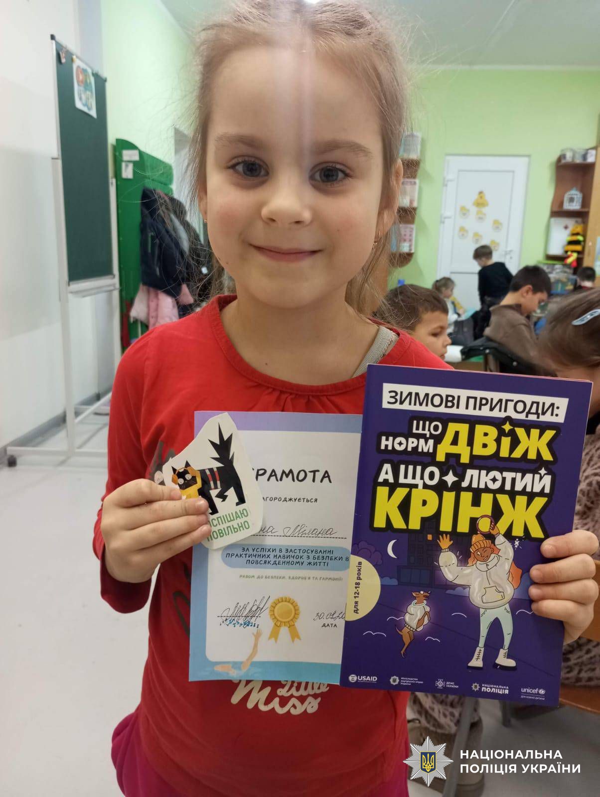 Особливу увагу інспекторка приділила алгоритму дій у разі виявлення небезпечних предметів. Разом з поліцейською першокласники вивчили правило з трьох життєважливих слів — «Не торкайся — відійди — повідом дорослого».